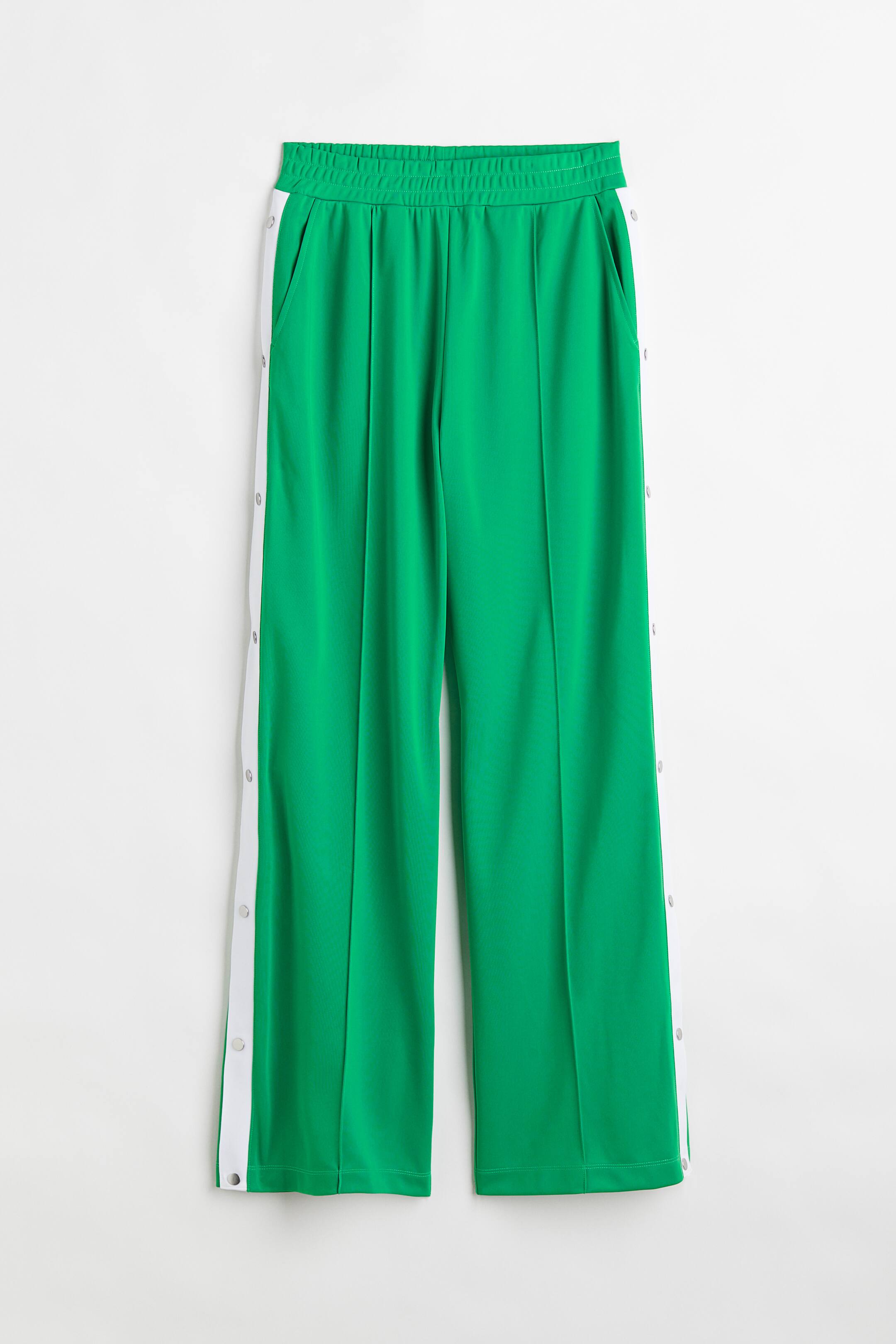 Track pants with contrasting colour side stripes with press-studs. High waist with covered elastication, diagonal side pockets and wide, straight legs with sewn-in creases.
