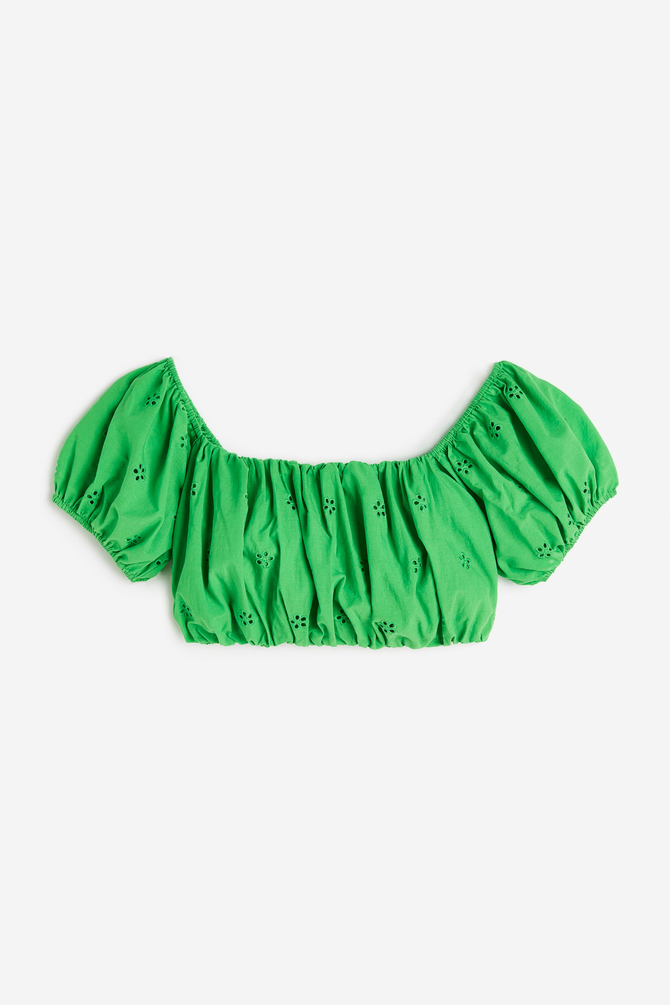 Top court en coton tissé avec broderie anglaise. Modèle épaules nues avec encolure carrée et courtes manches bouffantes. Petit élastique à l'encolure, en bas de manche et à la base. Doublé.
