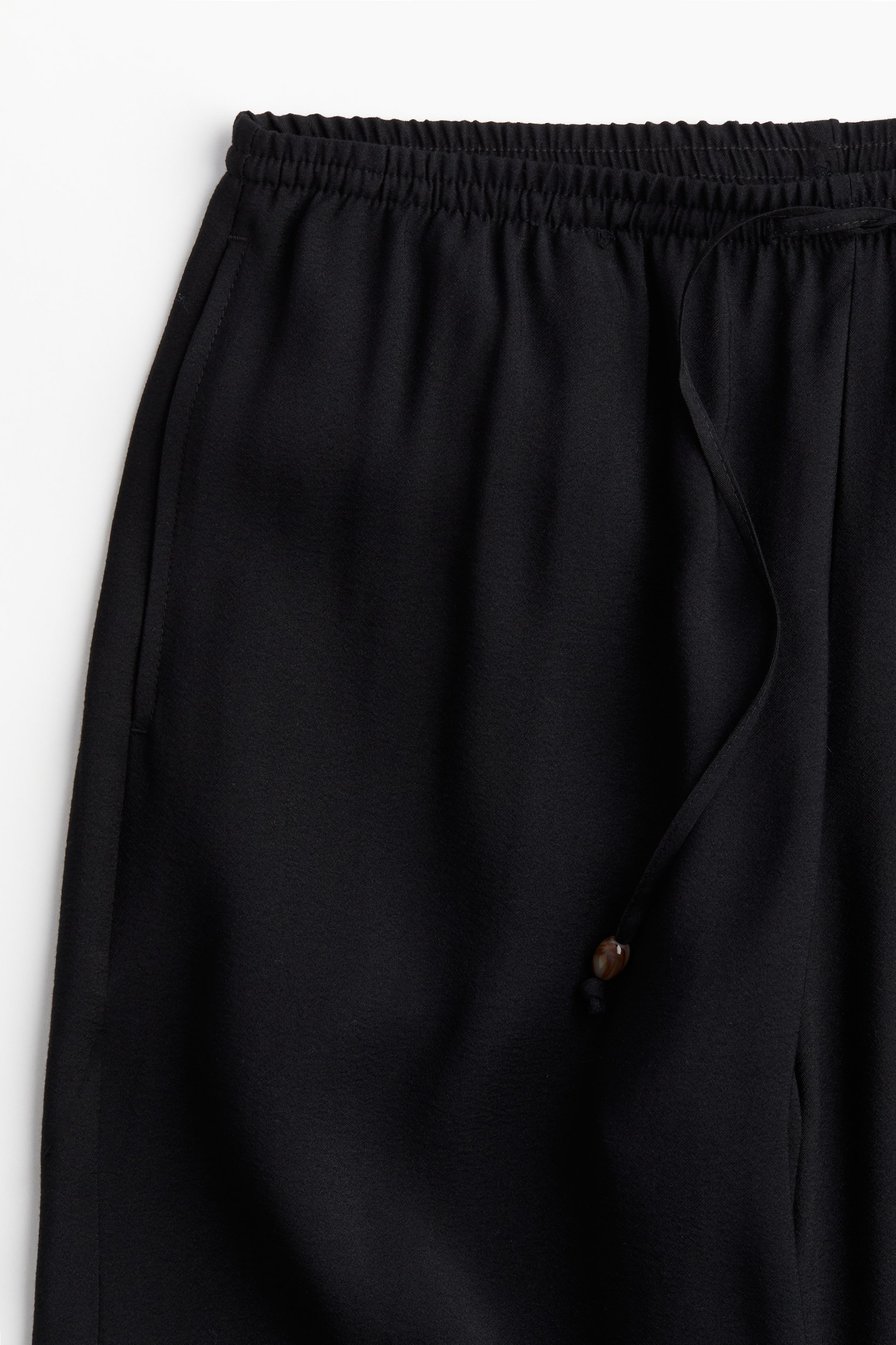 Pantalon en matière tissée. Coupe flottante avec élastique habillé et petit cordon de serrage à la taille. Poches latérales discrètes. Jambes larges.