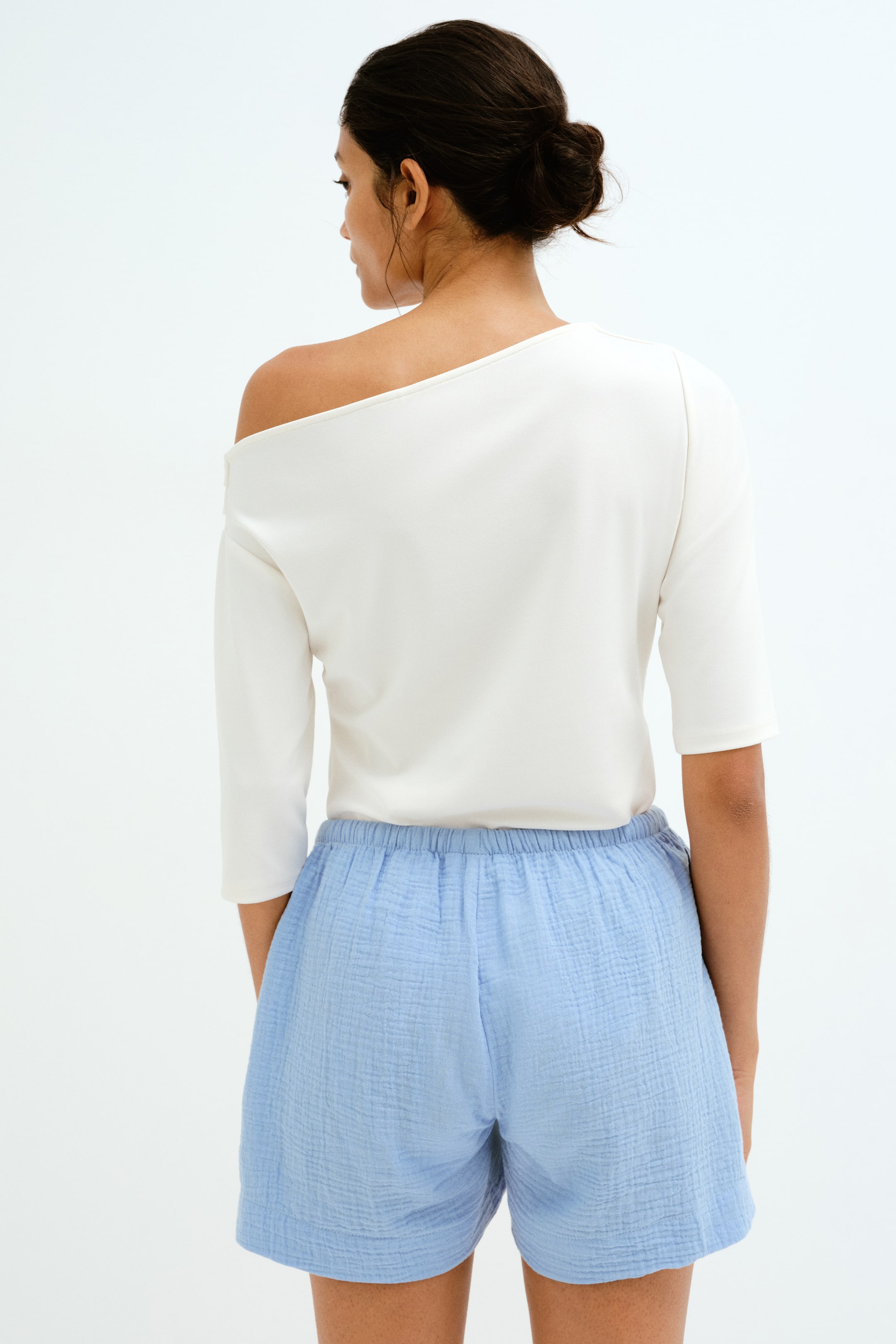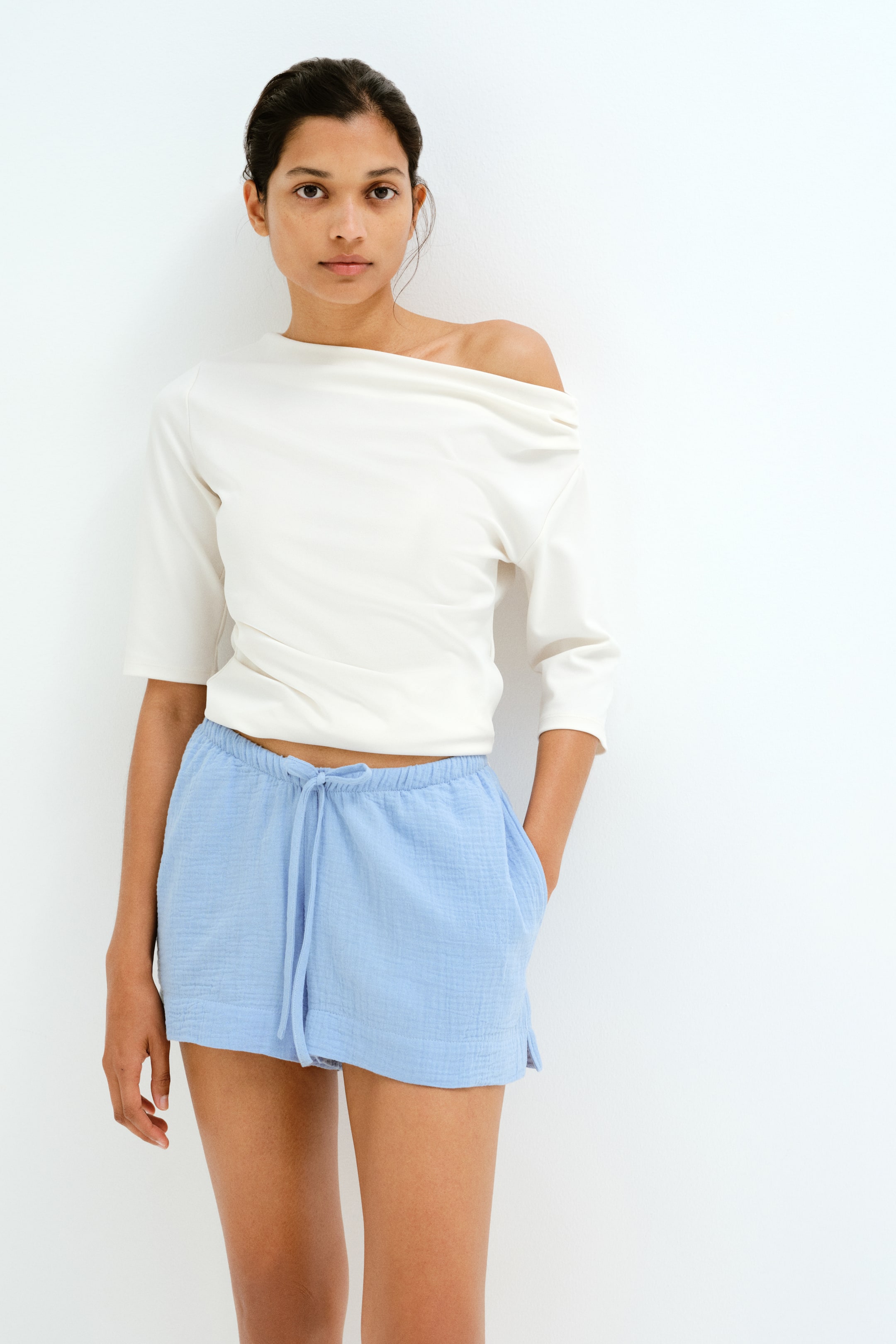Short en douce mousseline de coton. Coupe décontractée avec taille basse élastique et petit cordon de serrage dans la ceinture. Poches latérales discrètes. Petite fente en bas de jambe.
