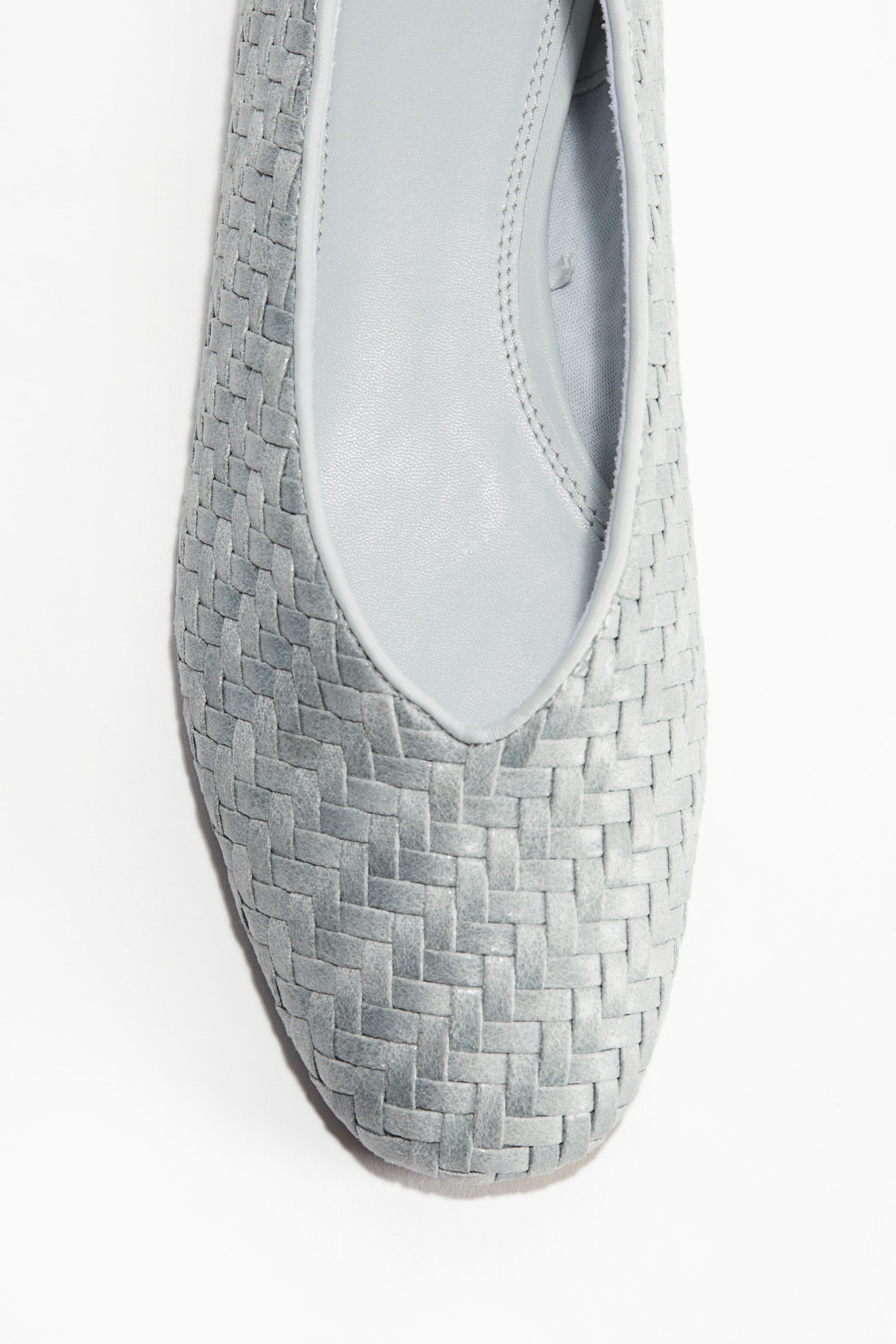 Ballerines tressées en tissu enduit à l'aspect légèrement usé. Modèle à bout rond avec boucle sur l'arrière. Doublure en jersey. Talon 0,6 cm.
