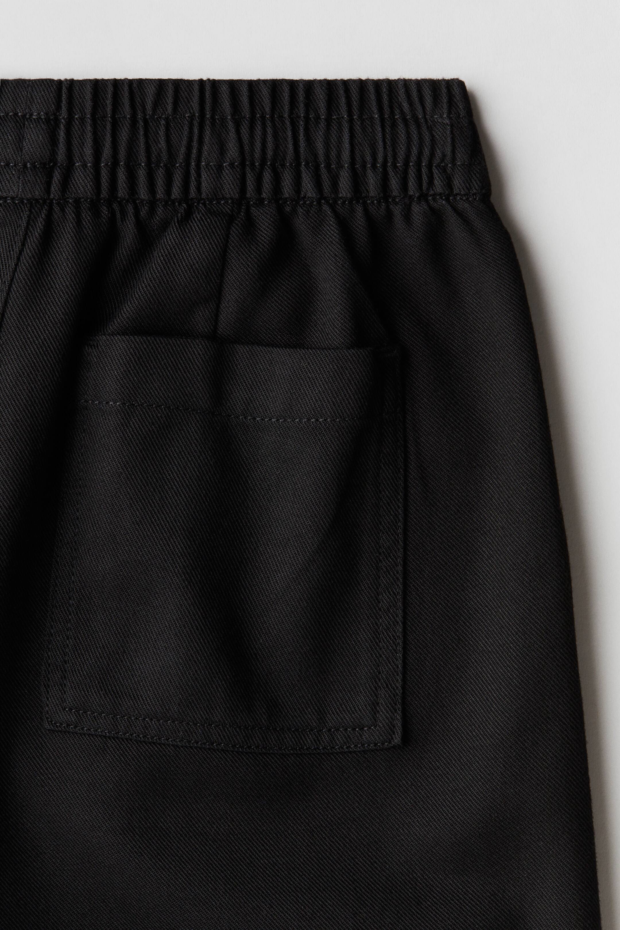 Short de longueur genou en twill souple. Coupe flottante avec élastique et cordon de serrage dissimulé à la taille. Pinces devant. Poches italiennes et poche plaquée dans le dos.