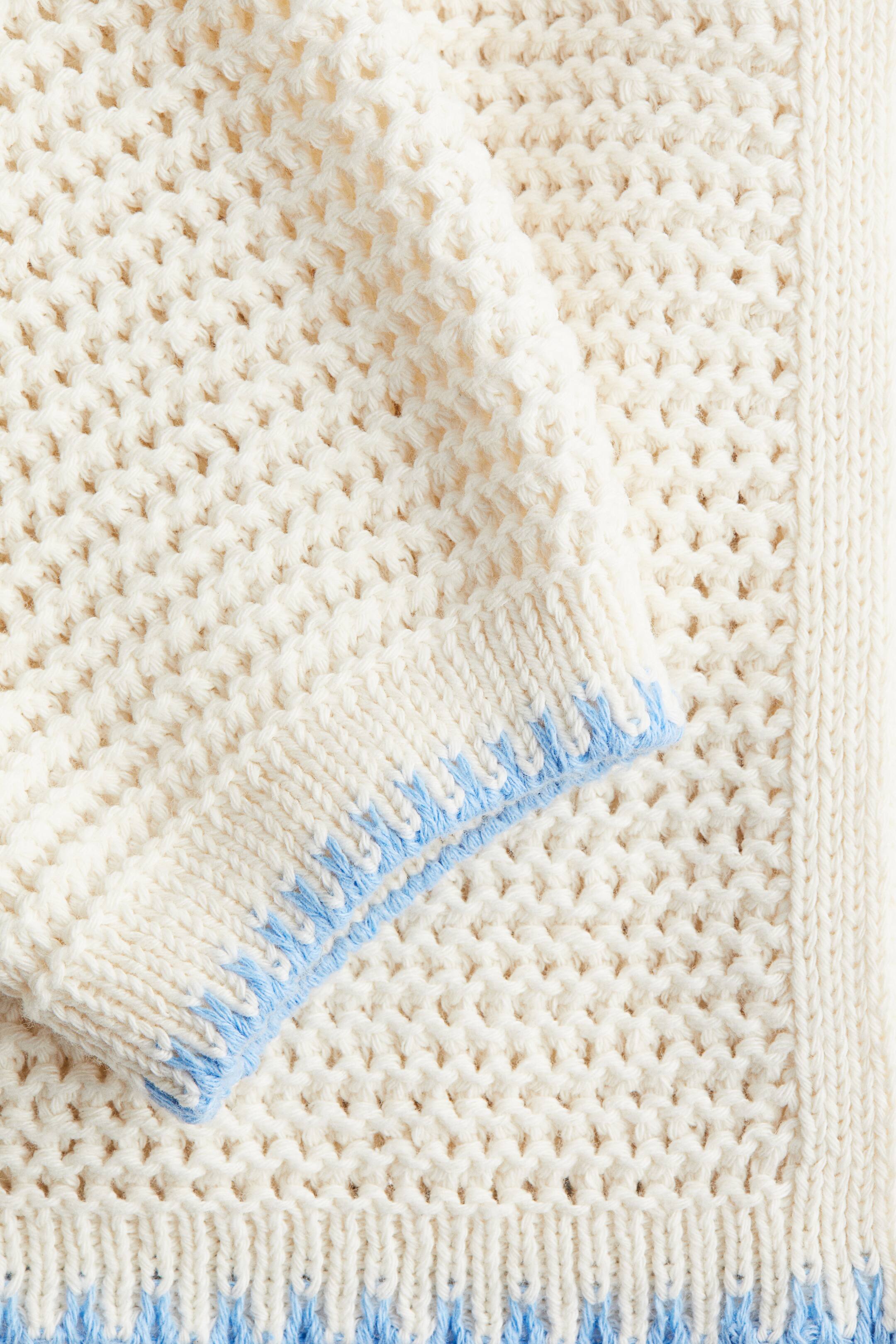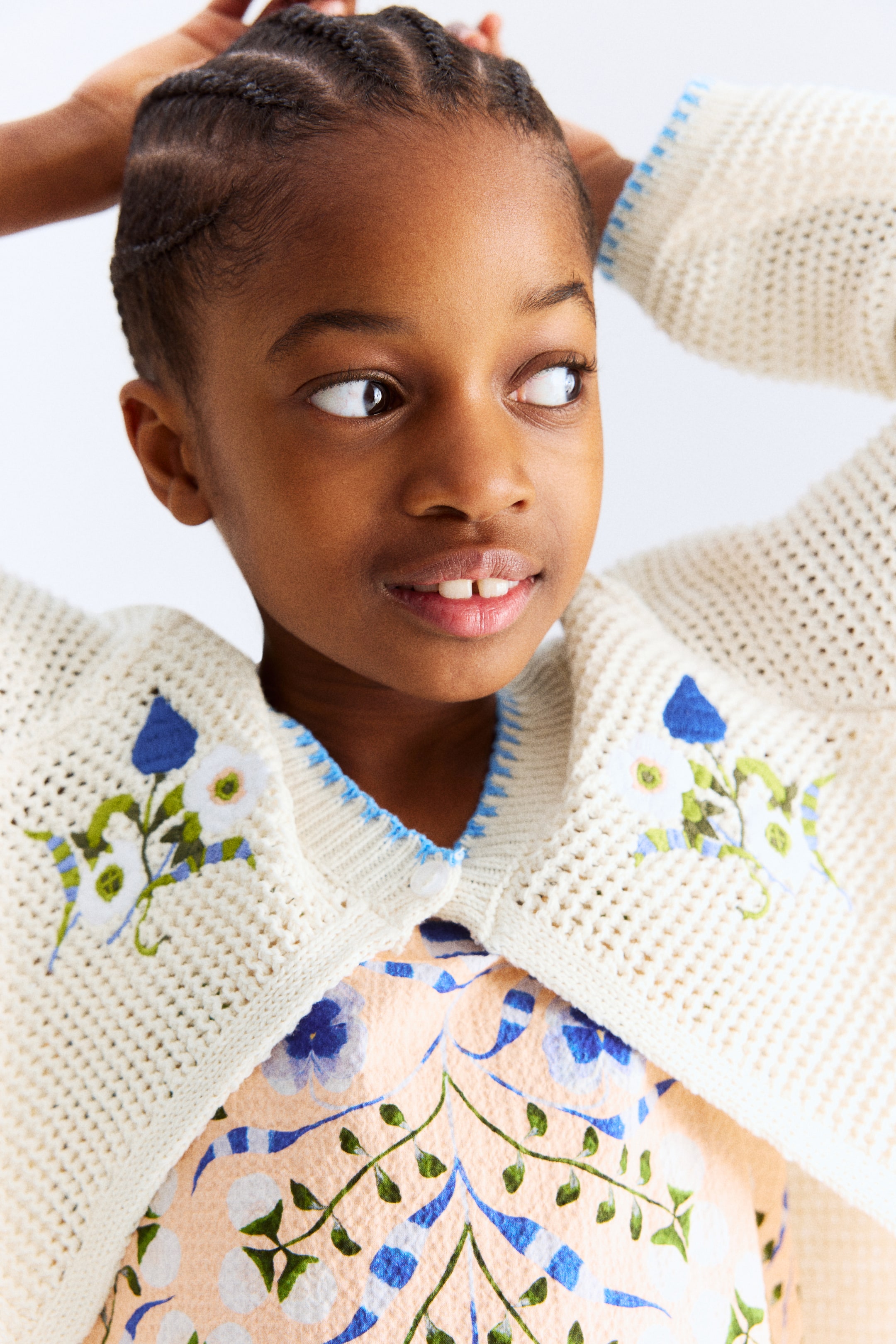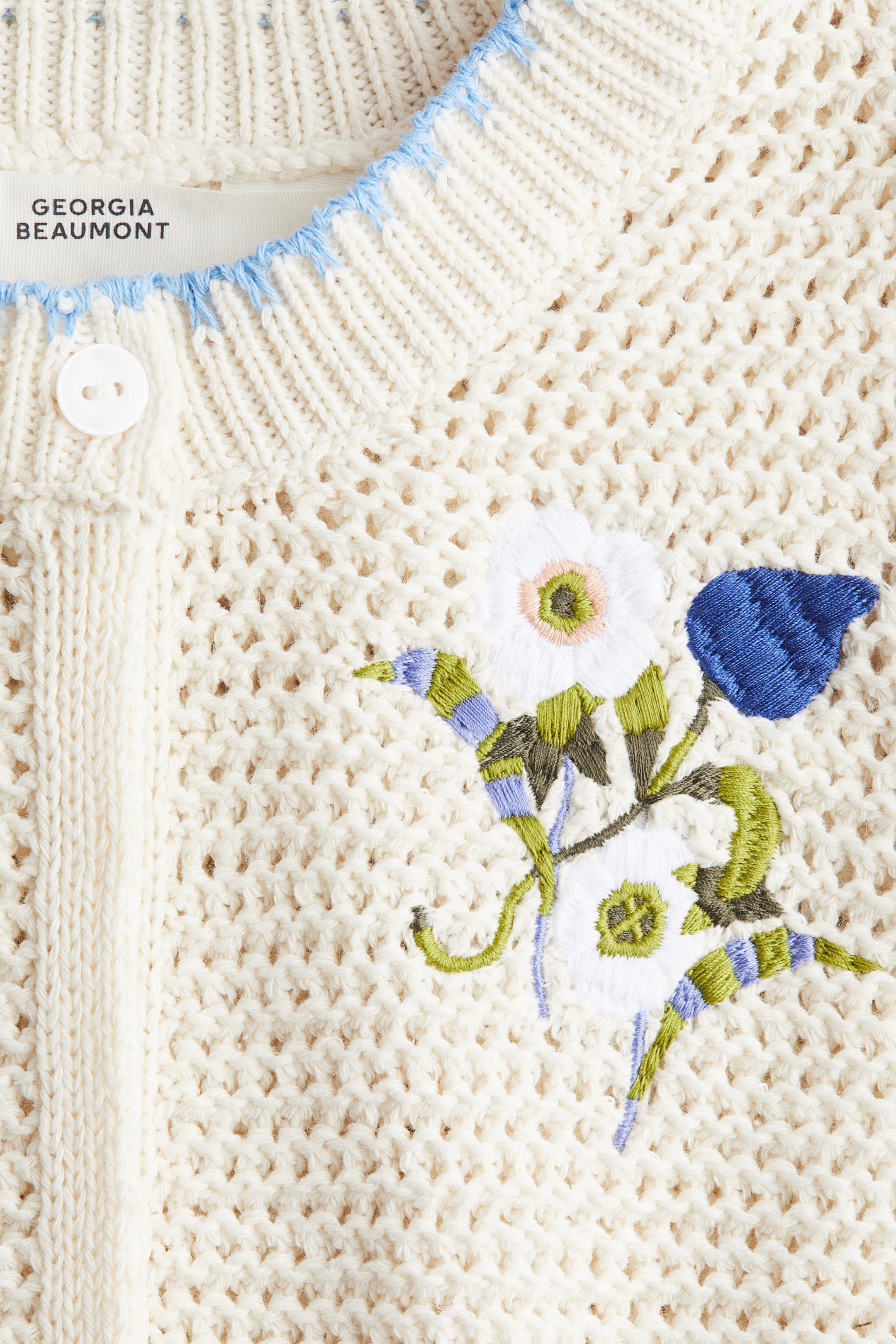 H&M x Georgia Beaumont. Gilet en maille douce façon crochet avec motifs brodés devant. Modèle à manches longues avec encolure ronde et fermeture par bouton en haut. Finition côtelé avec bord contrastant à l'encolure, aux poignets et à la base.