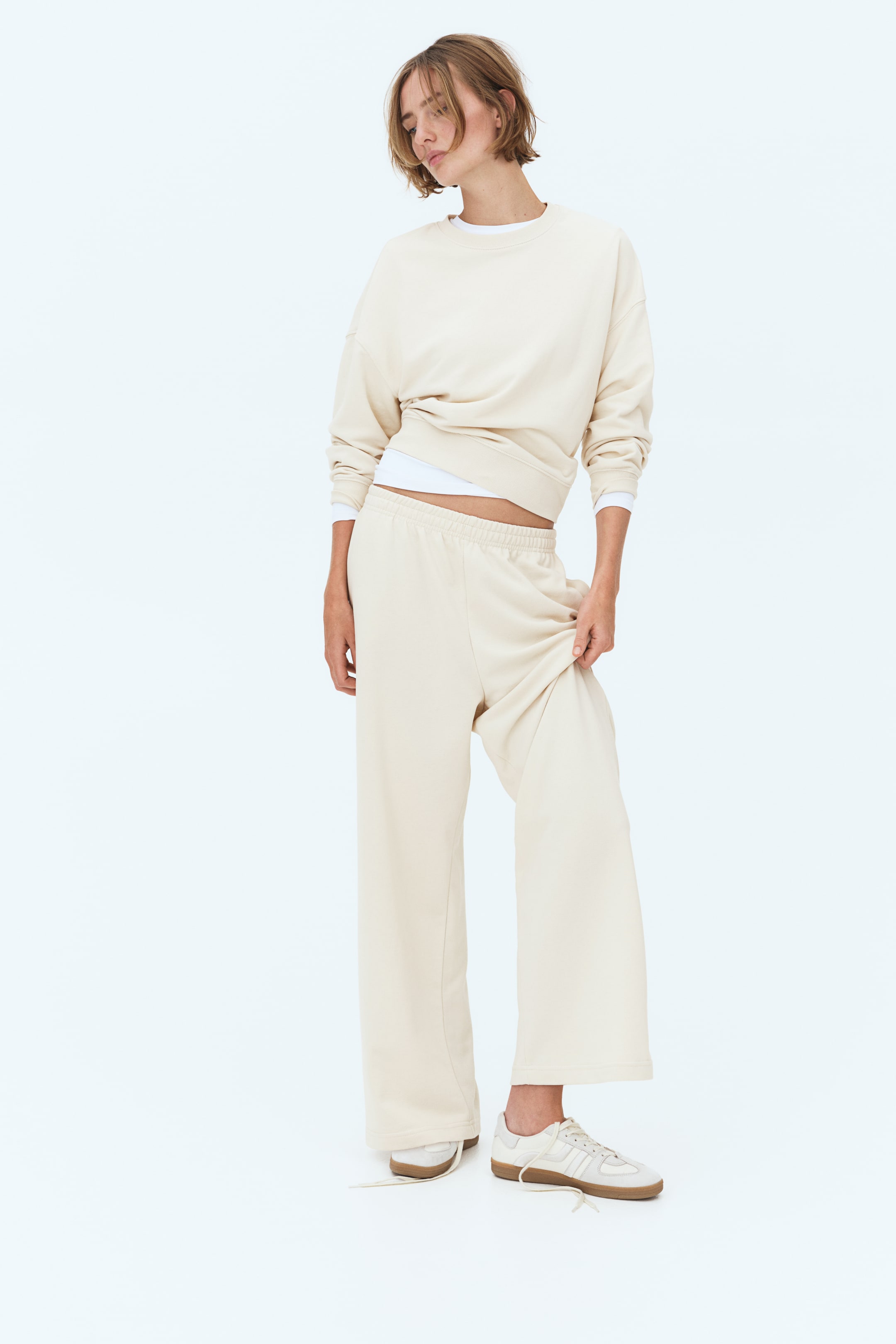 Sweat en molleton léger de coton mélangé. Modèle ras-du-cou avec emmanchures fortement descendues et manches longues. Finition bord-côte aux poignets et à la base.