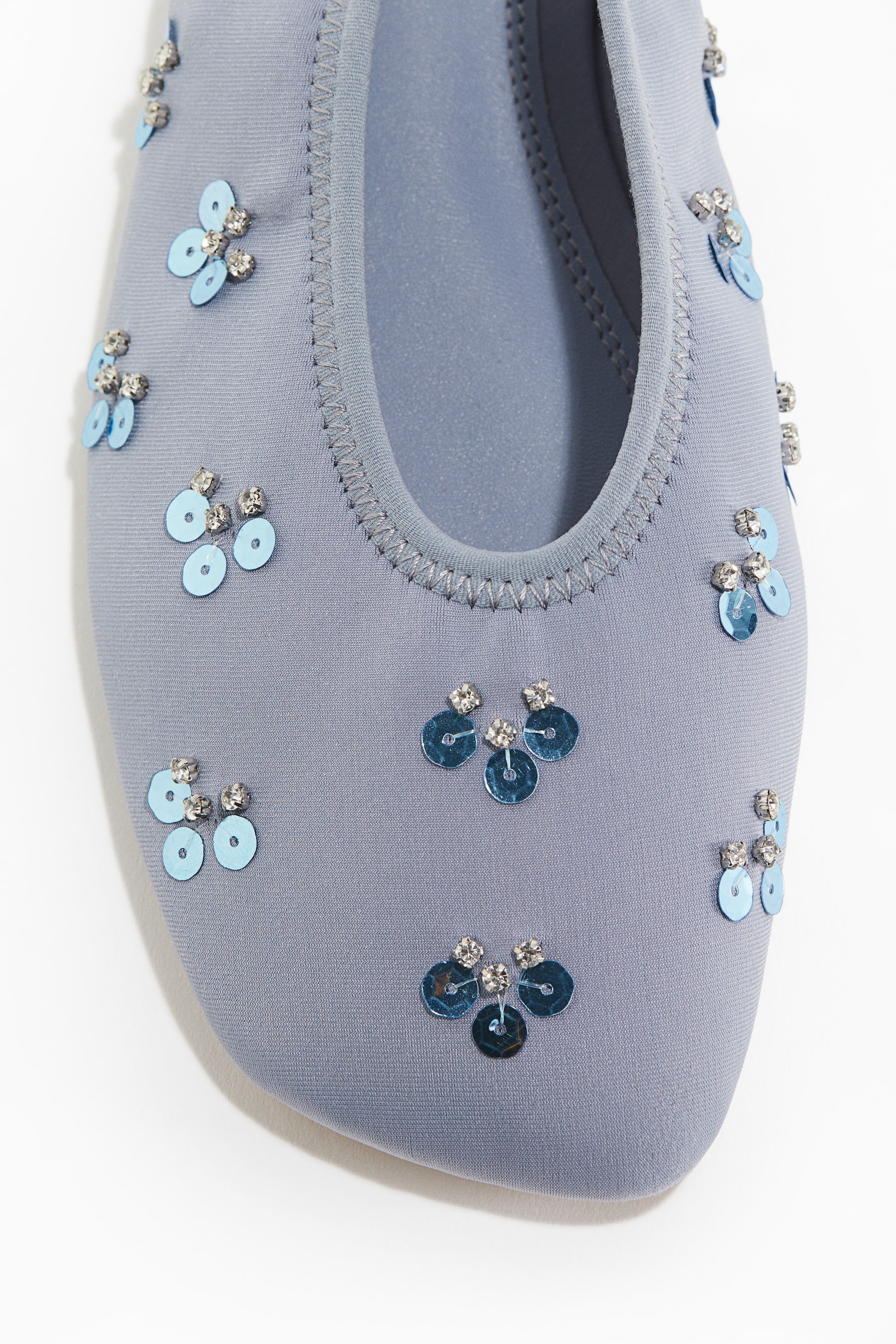 Escarpins en jersey avec amas de sequins et de strass formant un motif étincelant. Modèle à bout anguleux avec bride munie d'un élastique habillé sur l'arrière. Doublure en jersey.