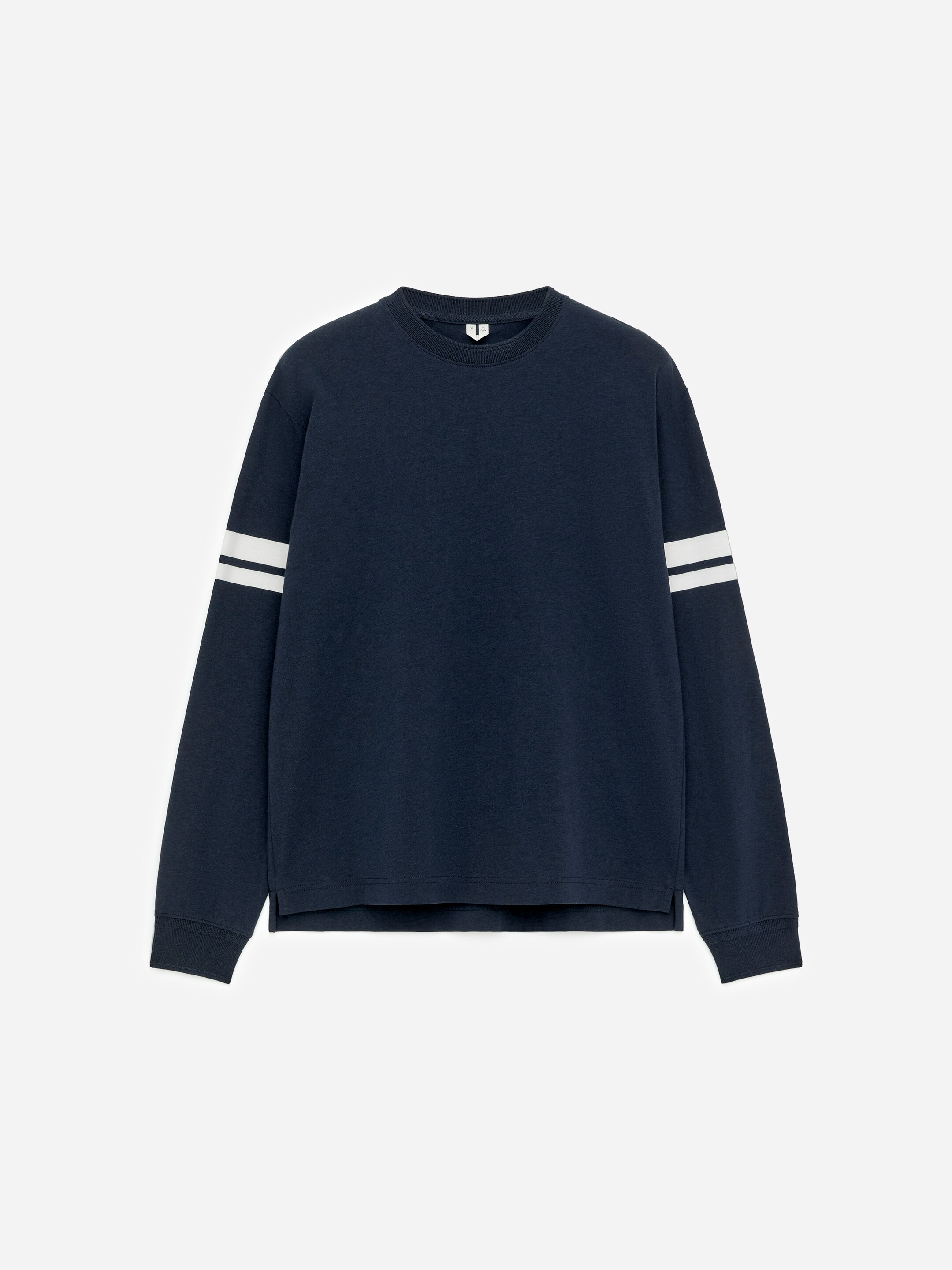 T-shirt à manches longues de coupe standard. Un modèle à col rond avec des bordures côtelées à l'encolure et aux poignets. Fentes au niveau des coutures latérales. Rayures en fil teint sur les manches.