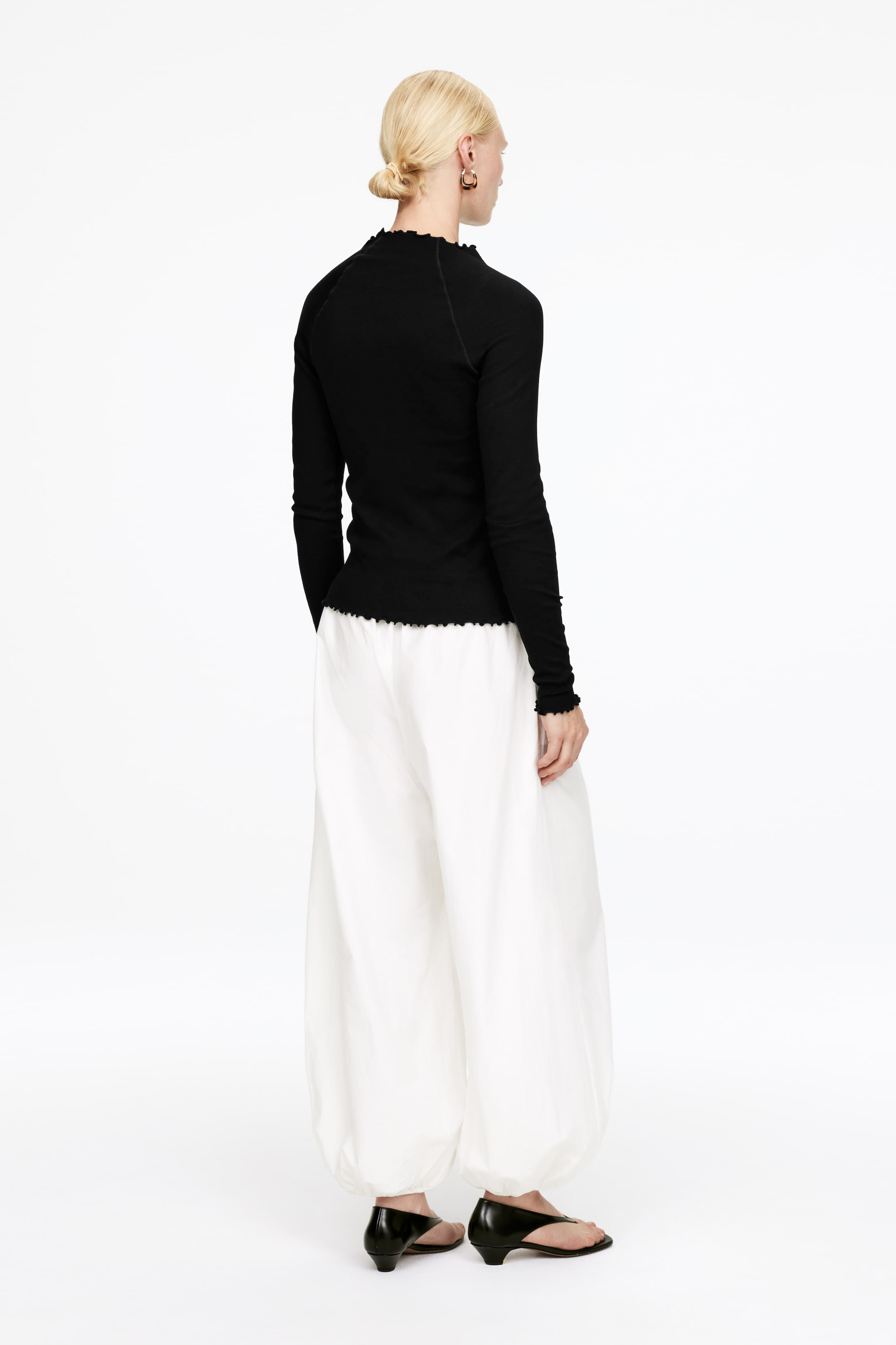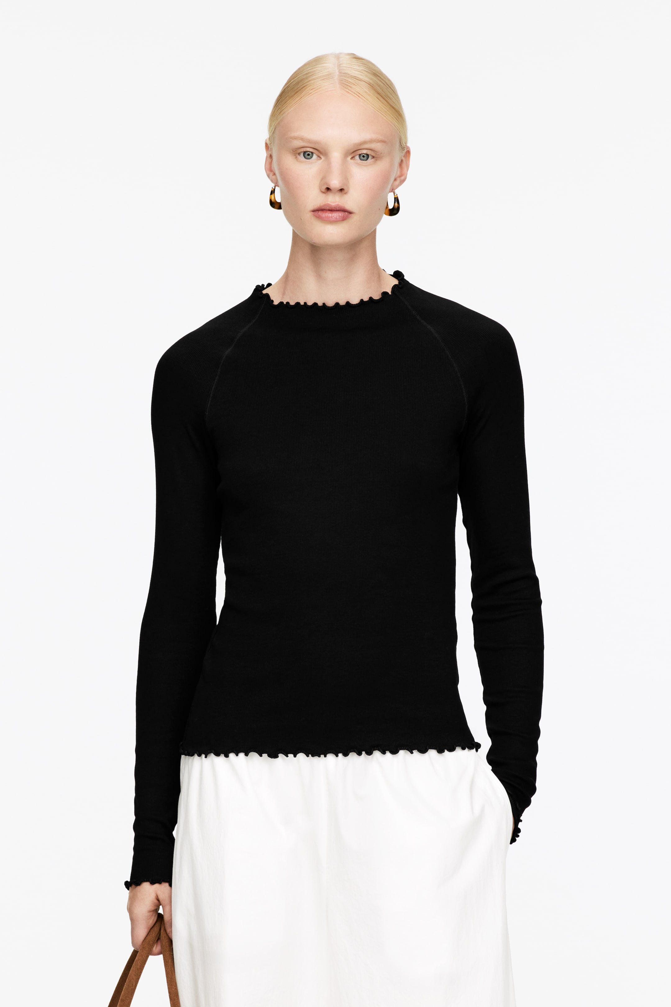 T-shirt en maille côtelée à manches longues. Modèle confectionné en coton avec un soupçon d'élasthanne. Modèle de coupe ajustée avec un col montant, des bordures roulottées et des manches raglan.