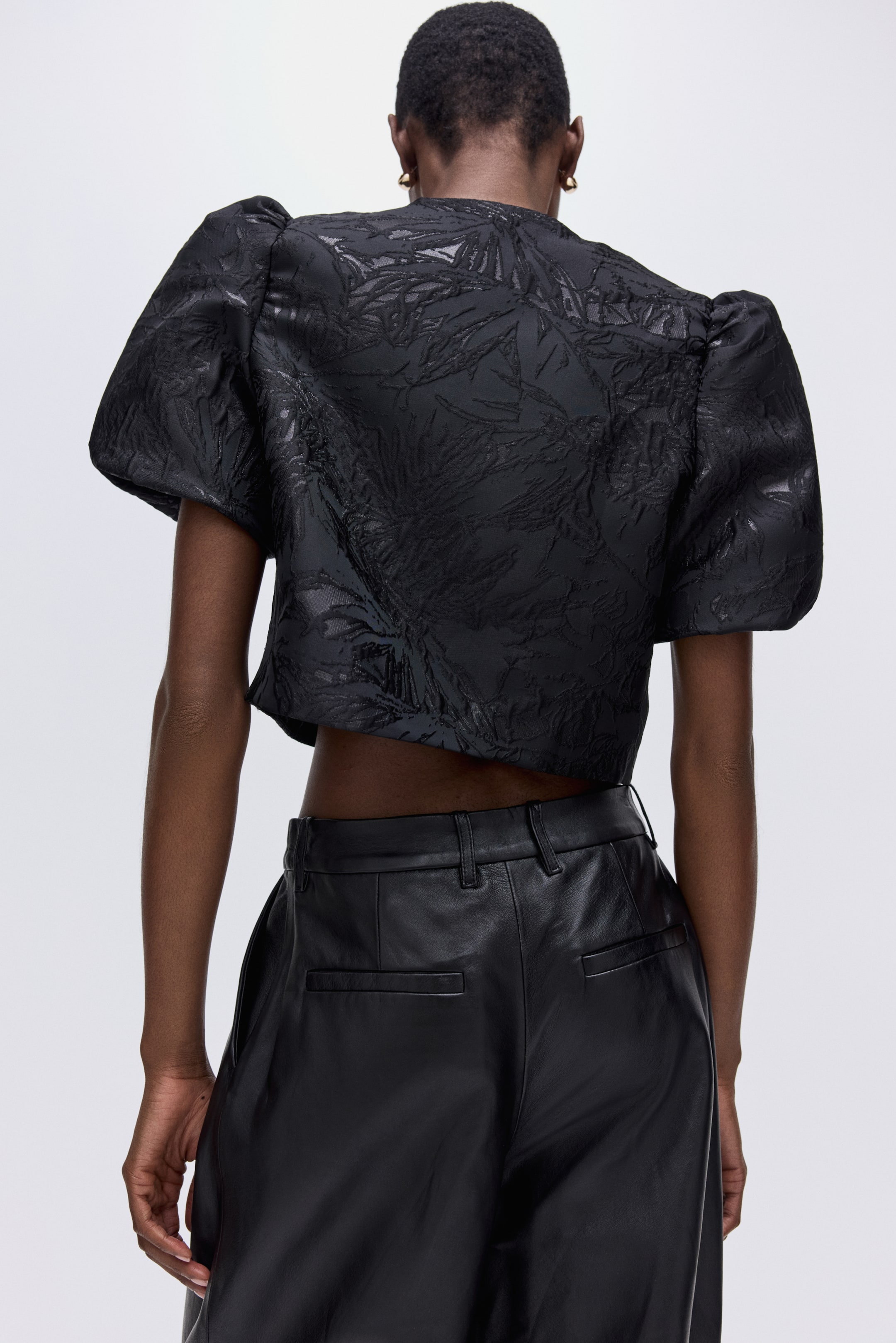 Short blouse in woven fabric with a round neckline and short puff sleeves. Gently hammered metal buttons down the front.