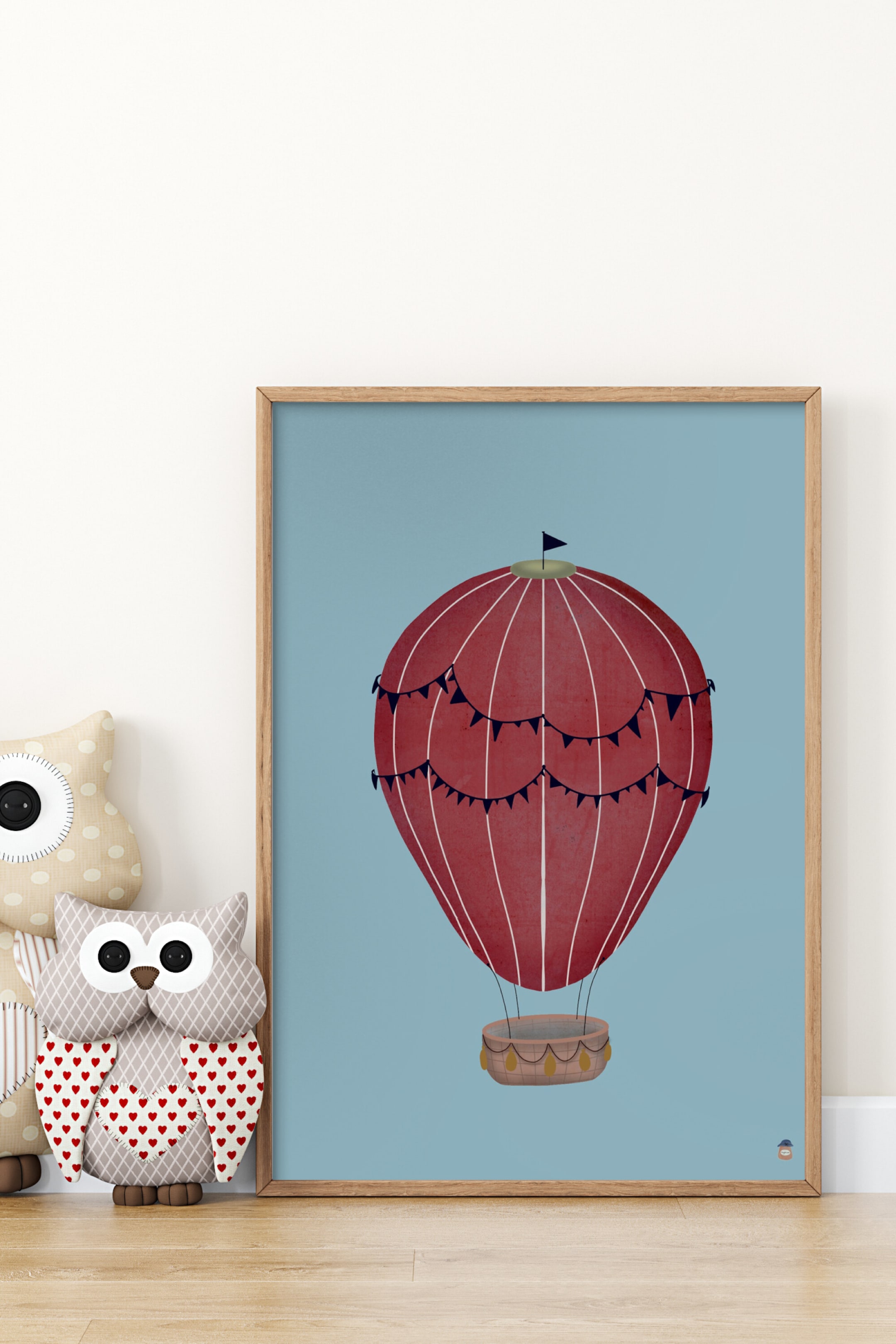 ** Cadre non inclus. ** Ce poster enchanteur présente une montgolfière de style vintage dans une teinte rouge profonde, décorée de fanions délicats et d'un petit drapeau en haut. Sur un fond bleu atténué, l'œuvre dégage un charme nostalgique et fantaisiste. Son design élégant en fait un ajout parfait aux intérieurs inspirés par les voyages, aux chambres d'enfants ou aux collections d'art mural oniriques. Idéal pour ceux qui aiment l'aventure et l'esthétique vintage, cette impression unique apporte un sentiment d'émerveillement et d'exploration à tout espace.