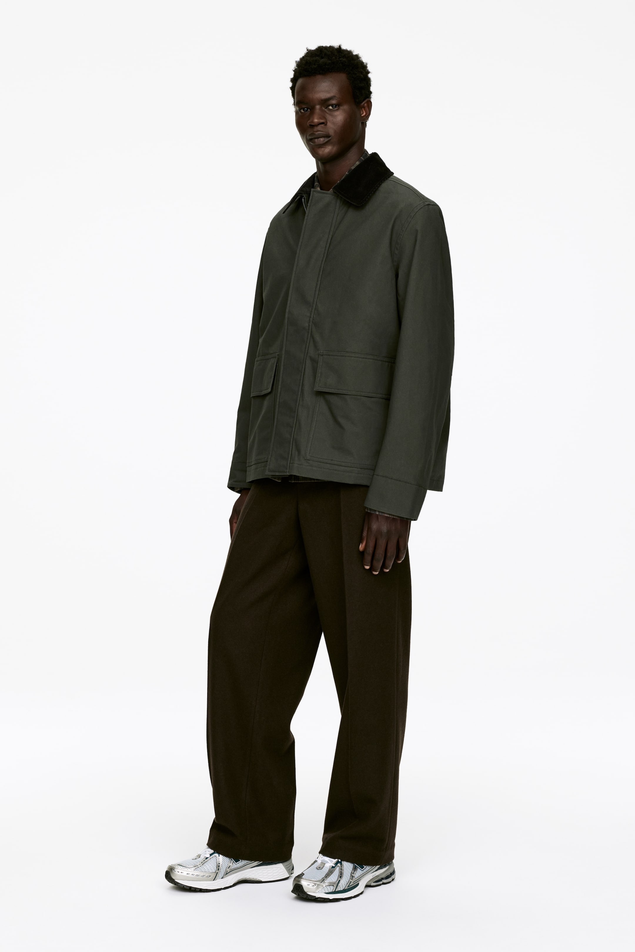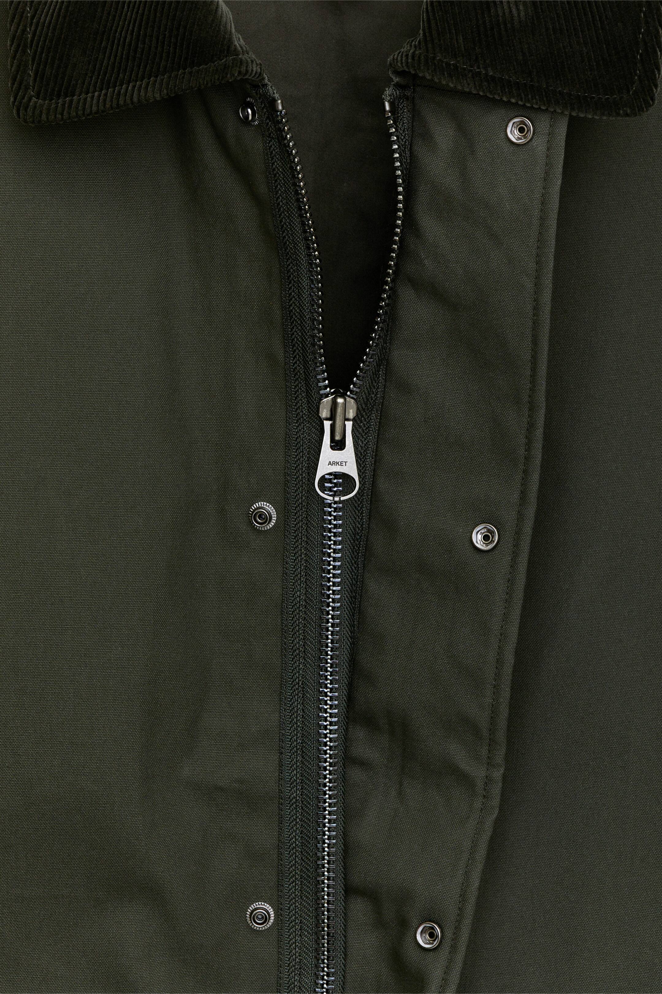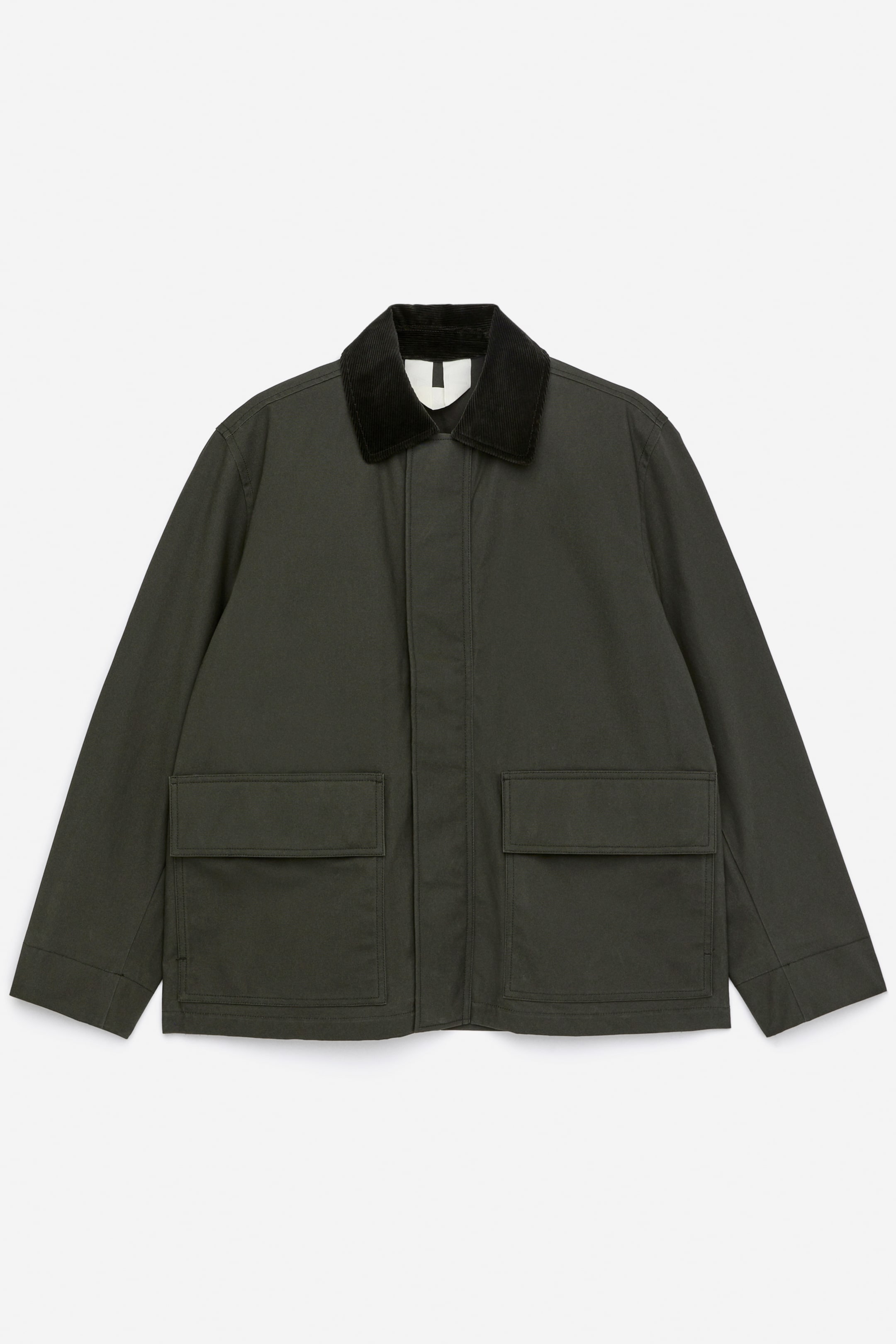 Viaszos felületű pamut dzseki. Kordbársony gallérral, elöl rejtett cipzáras és patentos záródással. Két gombos zsebbel. Belső zseb. Teljesen bélelt. Normál fazon.