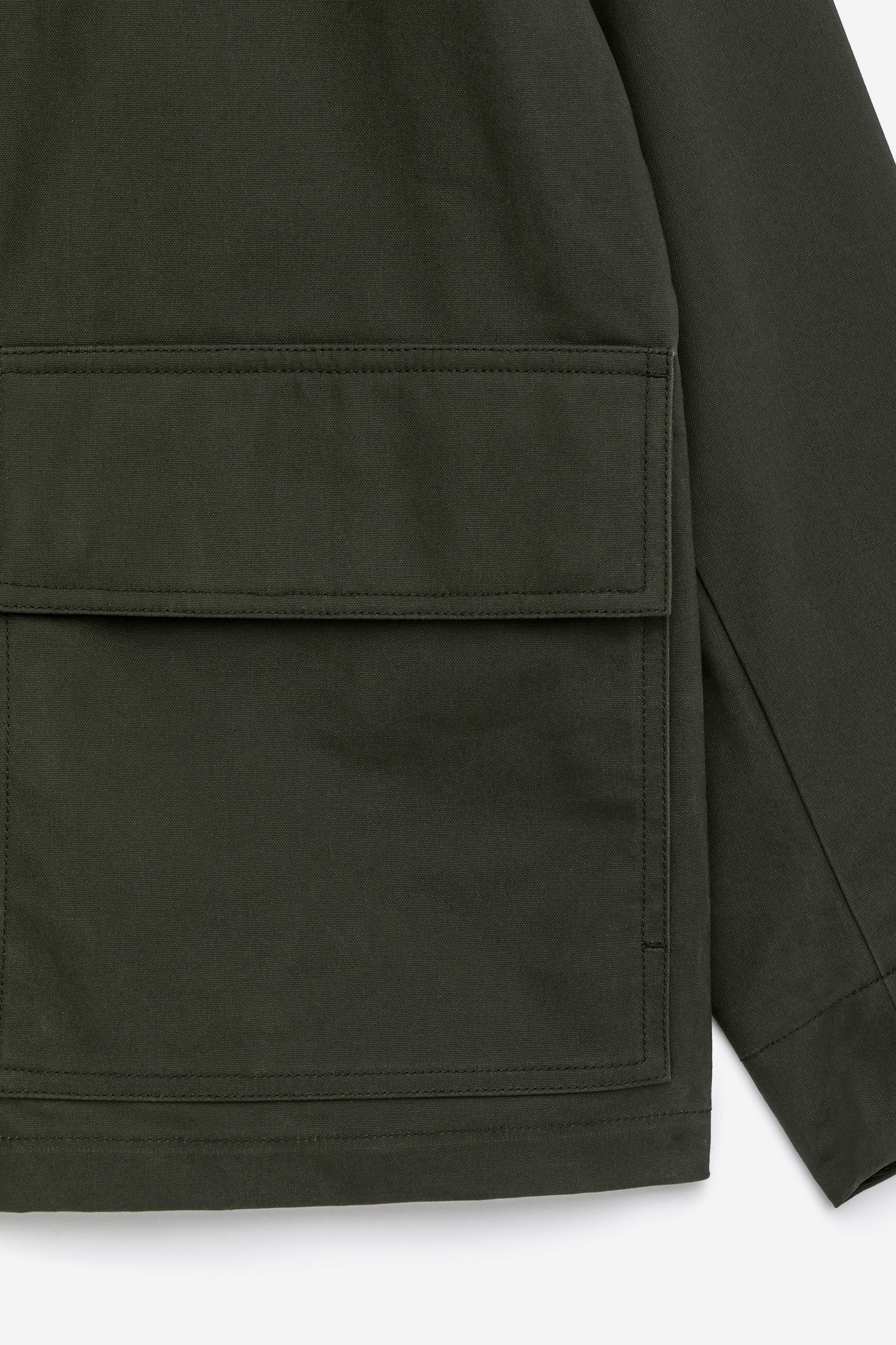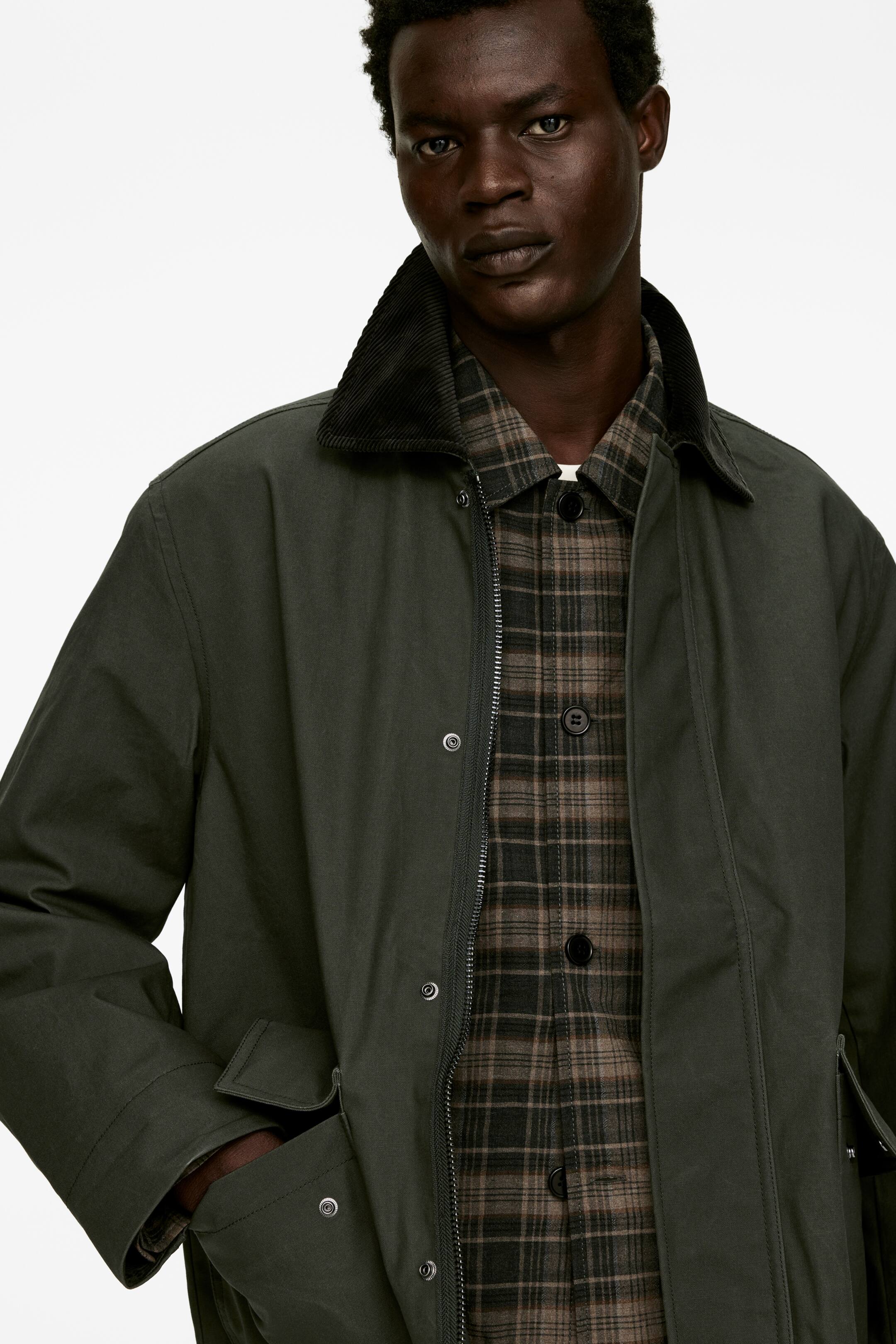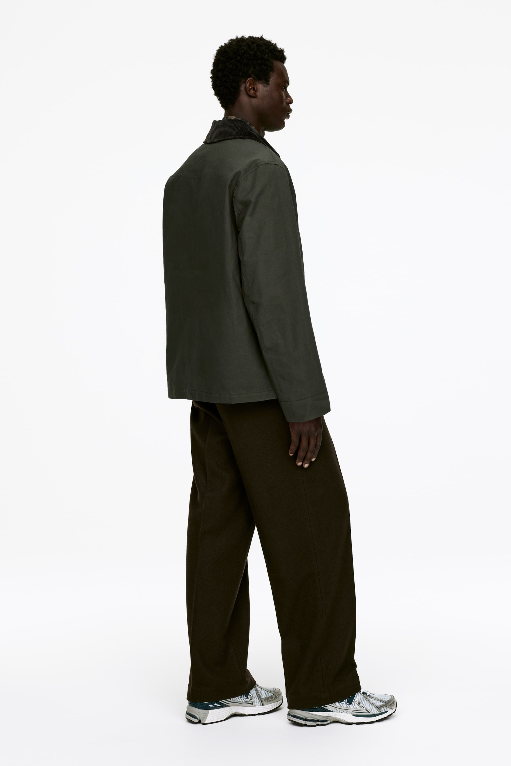 Viaszos felületű pamut dzseki. Kordbársony gallérral, elöl rejtett cipzáras és patentos záródással. Két gombos zsebbel. Belső zseb. Teljesen bélelt. Normál fazon.