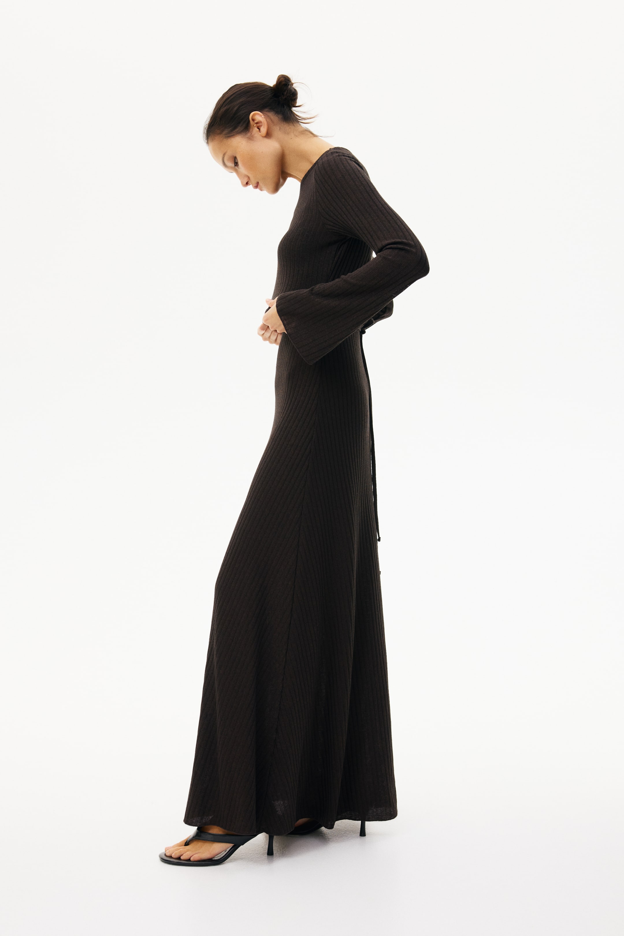 Puha, bordáskötött, bokáig érő szoptatós ruha kerek nyakkal, hosszú, bővülő ujjal, derekán hátul spagetti megkötővel, enyhén bővülő szoknyarésszel. Dupla rétegű felsőrésze benntartja a meleget, és megkönnyíti a szoptatást.