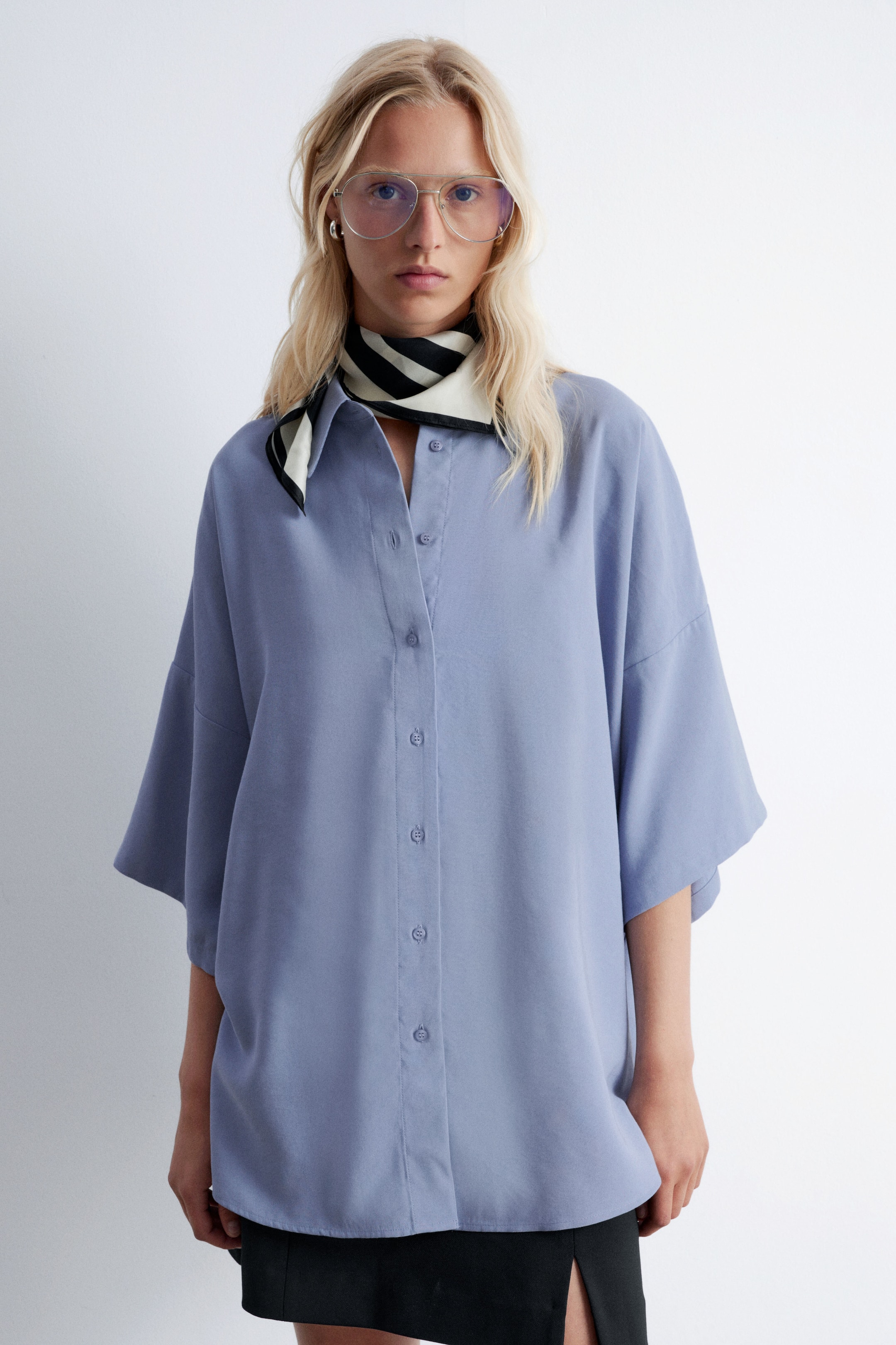 Könnyű anyagból szőtt, hosszú, oversized szabású ing. Klasszikus gallérral, bő, negyedes ujjakkal és lekerekített, oldalhasítékos szegéllyel. Ing hossza: 75.7 cm (S méret)