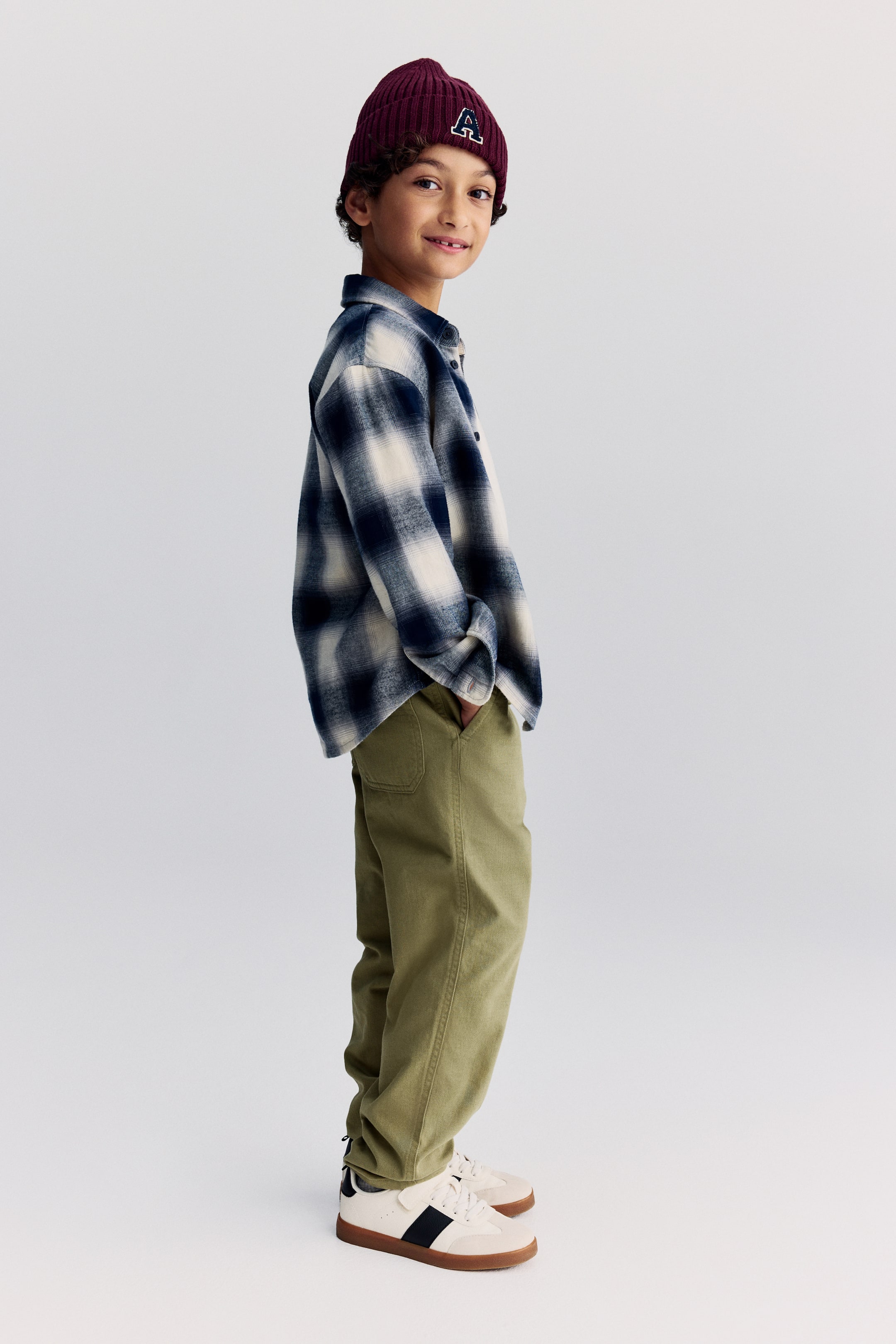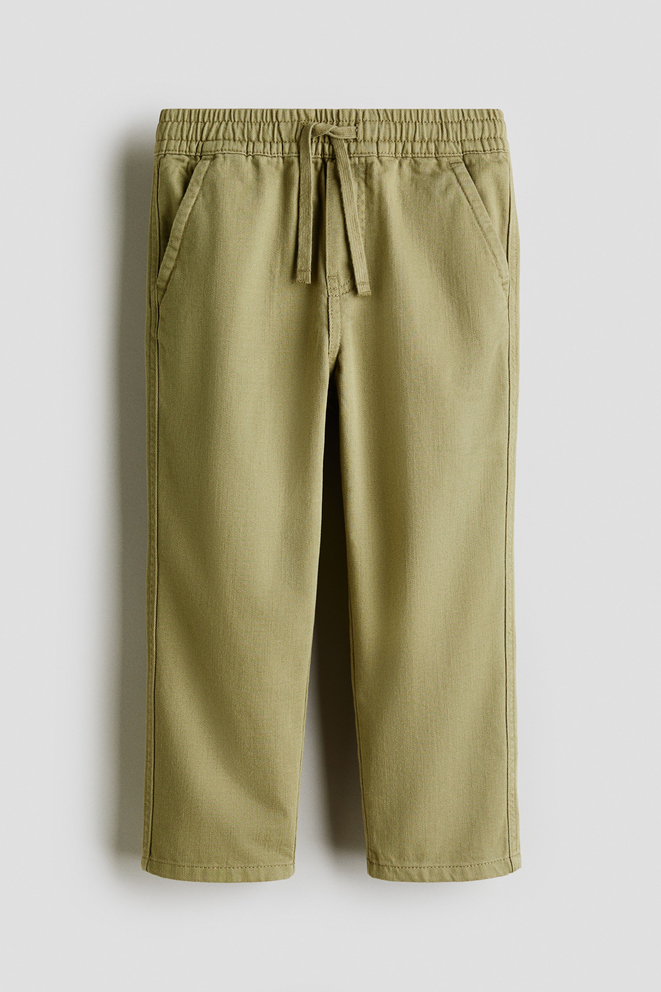 Puha, lezser fazonú pamuttwill nadrág behúzott gumis, húzózsinóros derékkal, álsliccel, ferde oldalzsebekkel, folt farzsebekkel, szűkülő szárral.