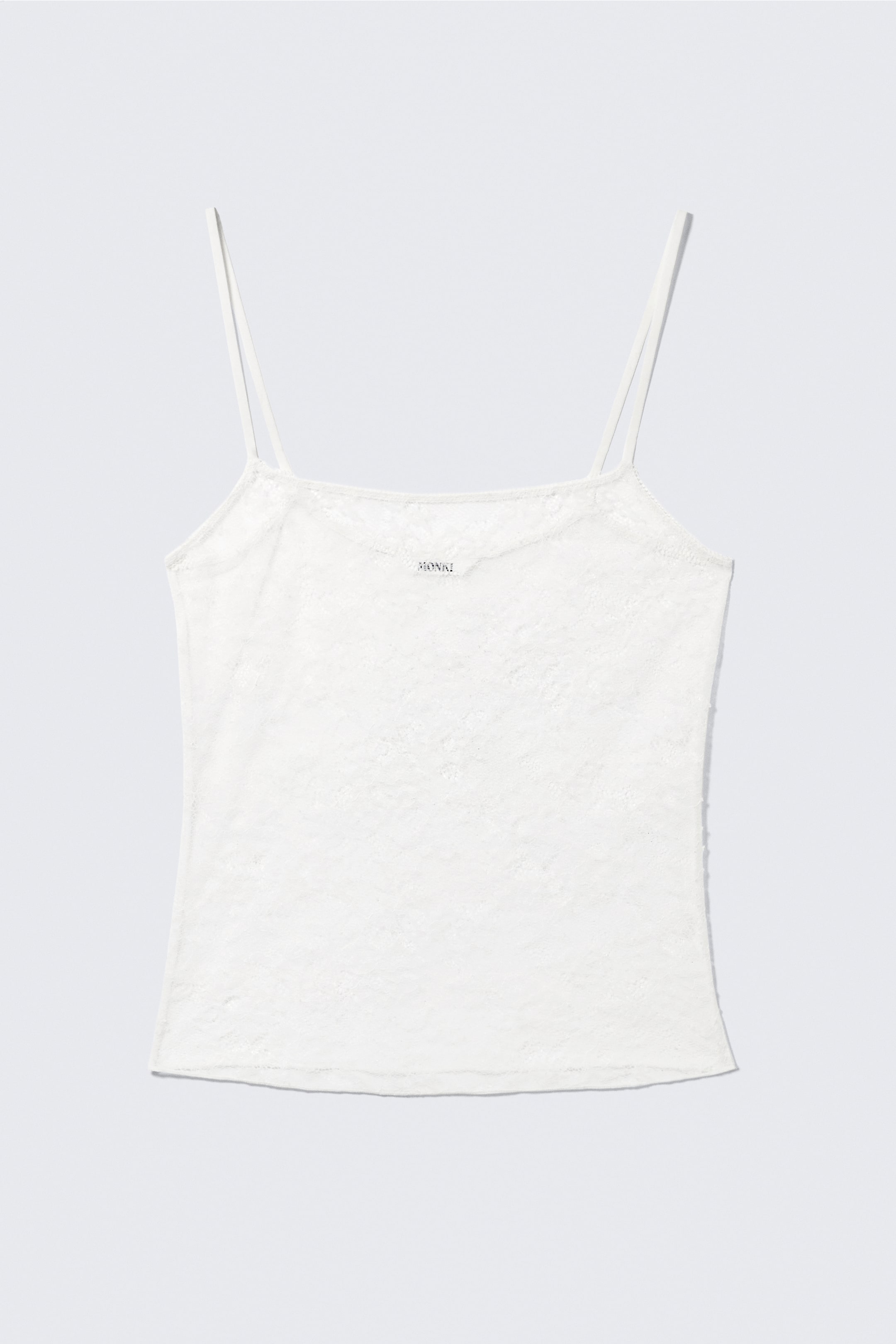 Karcsú szabású pizsama cami felső. Puha, rugalmas csipkéből készült, vékony vállpántokkal és finoman lekerekített nyakkivágással.