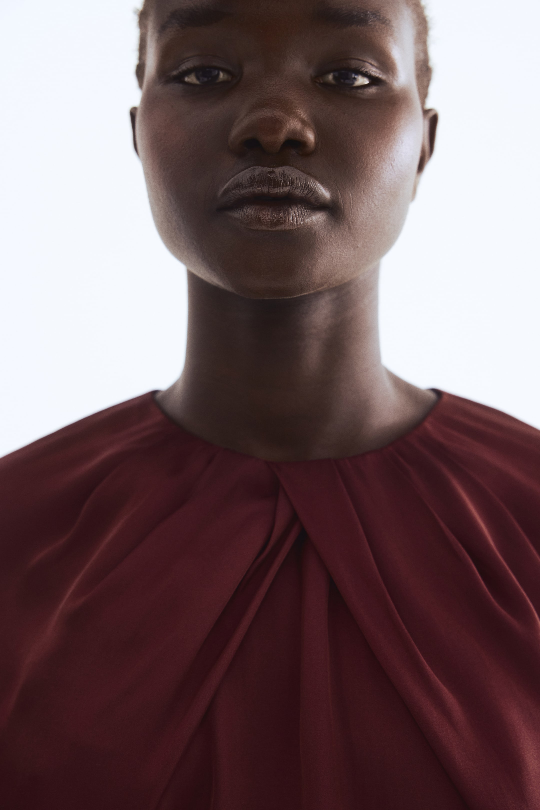 Lágy esésű szaténblúz kerek nyakkal, hátul gombos kulcslyuk-nyílással, hosszú, raglán, elöl átlapolt ballonujjal, széles, gombos kézelővel.