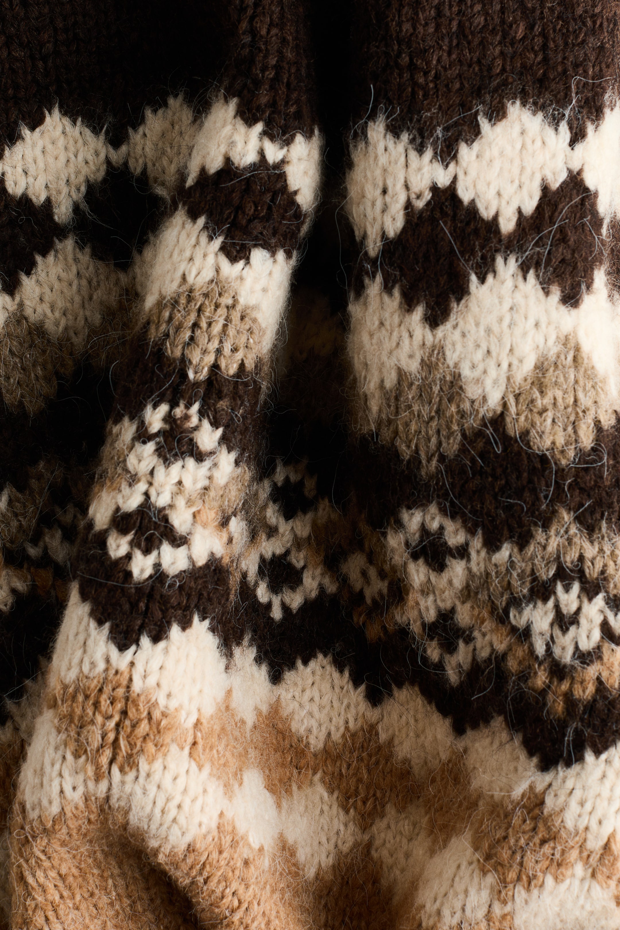 Puha, gyapjút tartalmazó, jacquard kötésű pulóver bordás magas nyakkal, enyhén ejtett vállal, hosszú ujjal, bordás passzés kézelővel és aljjal.