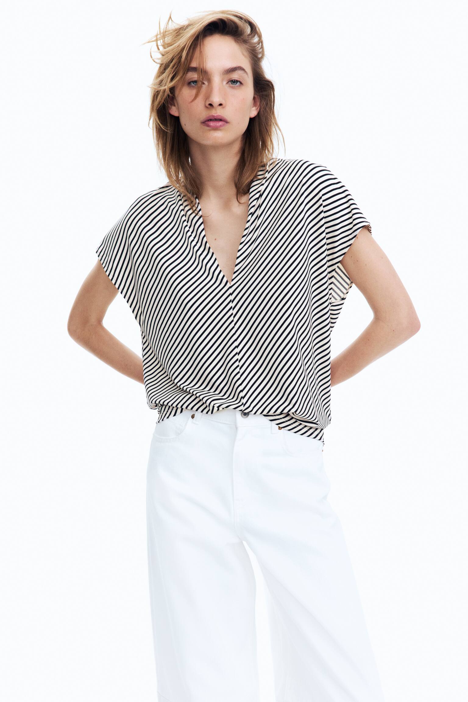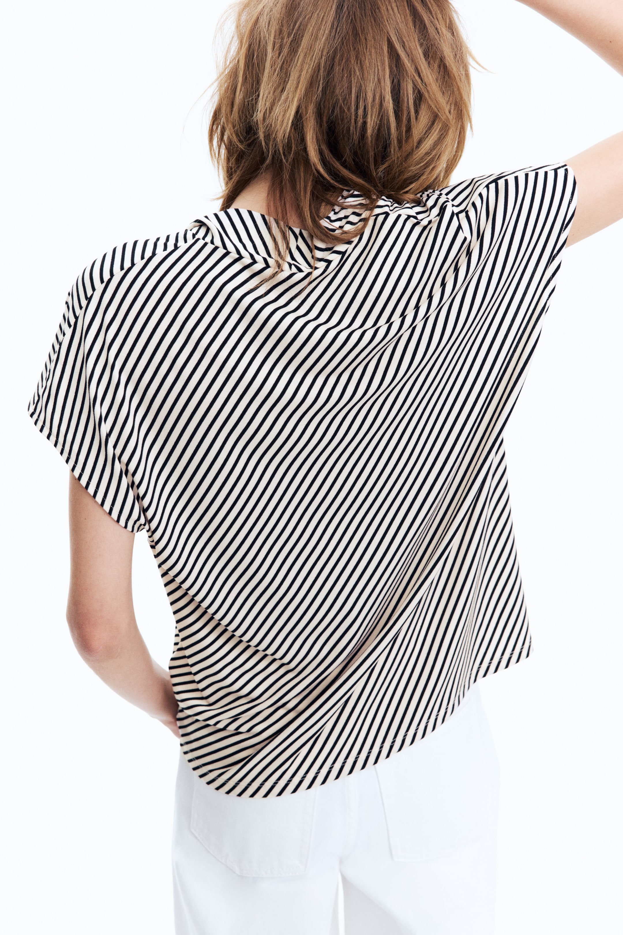 חולצה מג'רזי קרפ אוורירי עם מחשוף וי, חצי שרוול קצר וצווארון עומד קטן עם כיווצים בעורף.
