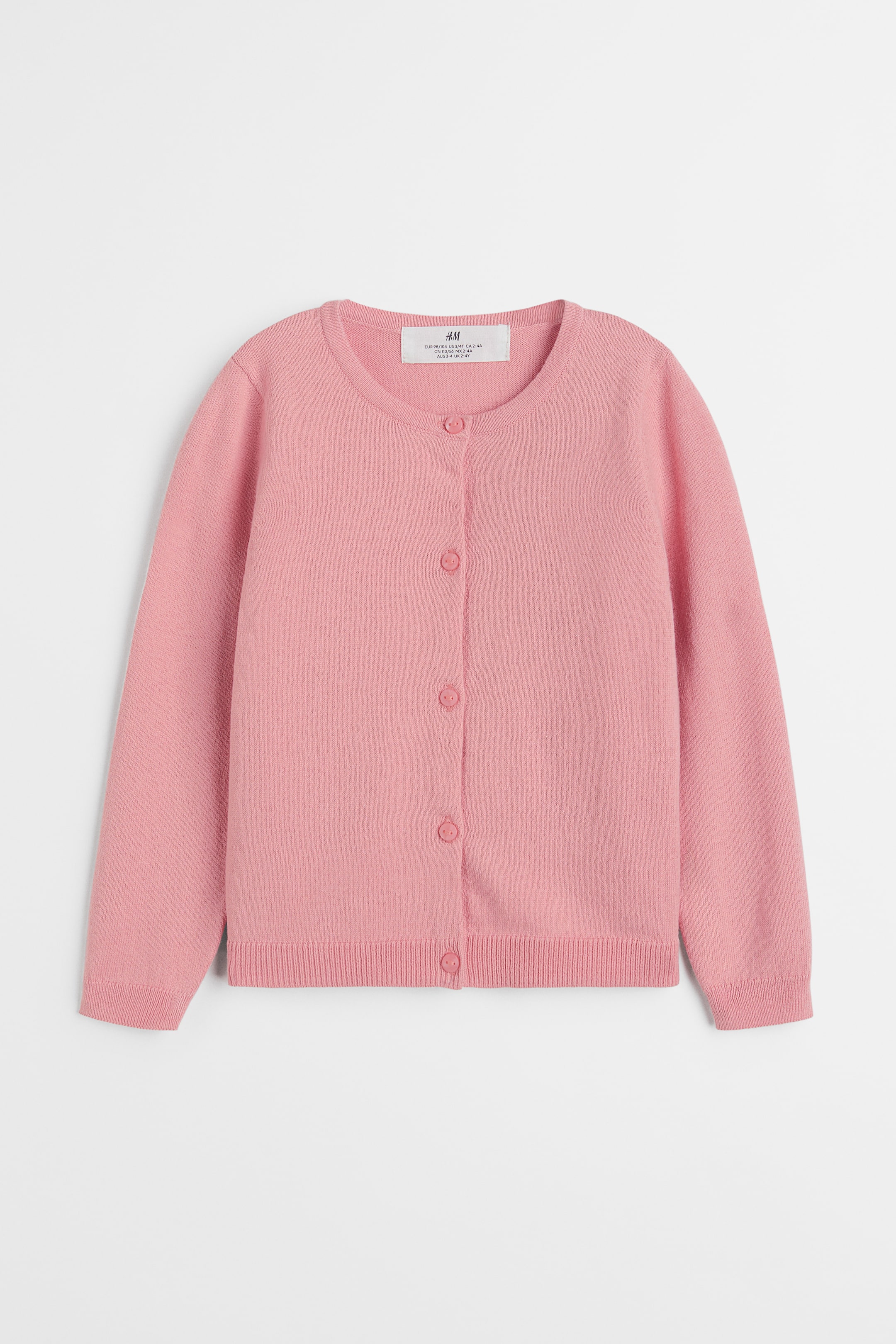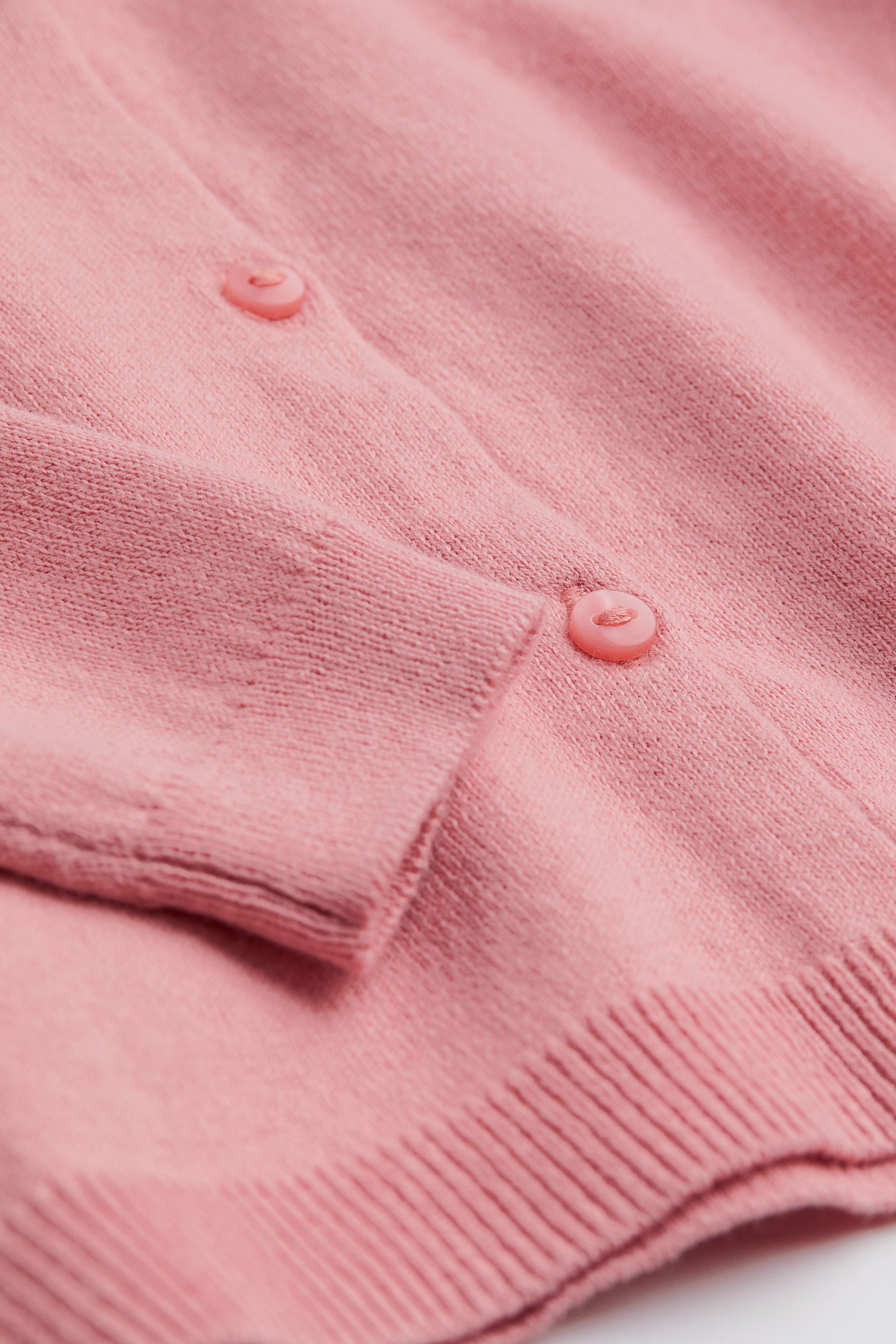 קרדיגן מסריג דק ורך עשוי כותנה עם כפתורים בחזית, שוליים ישרים וסיומת ריב בצווארון, בחפתים ובשוליים.