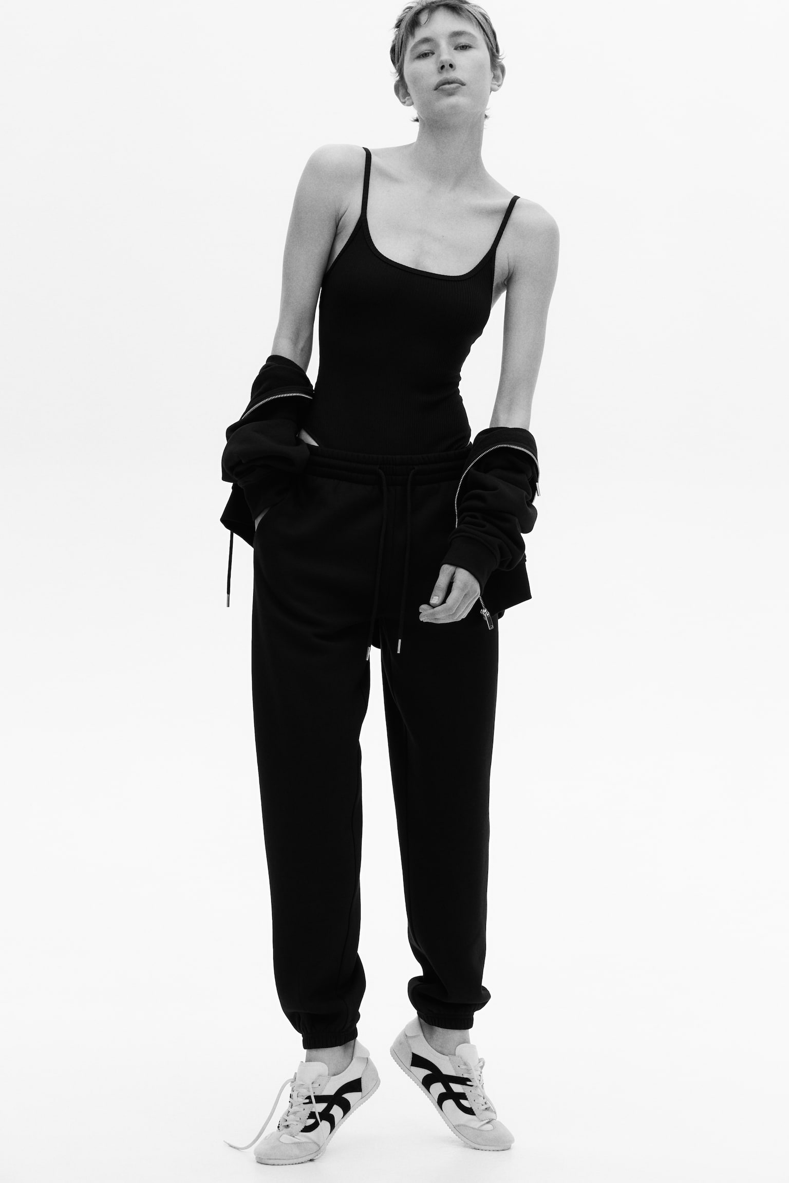 מכנסי טרנינג מבד פוטר רך עשוי תערובת כותנה. מותן גבוה עם גומי ושרוך קשירה, כיסים בצדדים וגומי בקרסול. צד פנימי סרוק ורך.