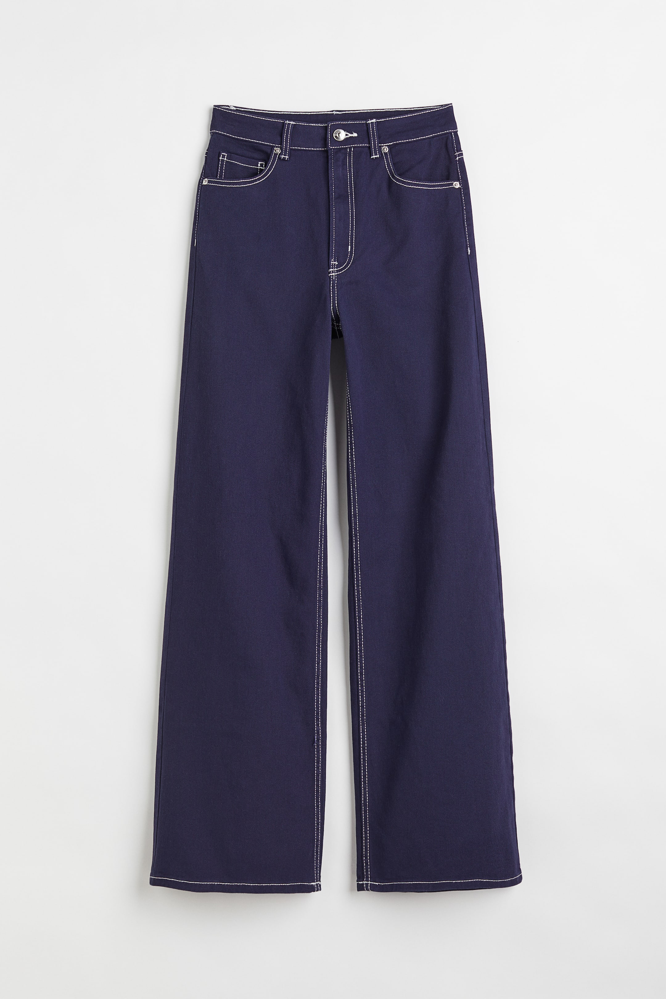 מכנסיים ארוכים עם 5 כיסים מכותנת טוויל סטרץ‘, מותן גבוה, רכיסה ברוכסן וכפתור ורגל רחבה וישרה.
