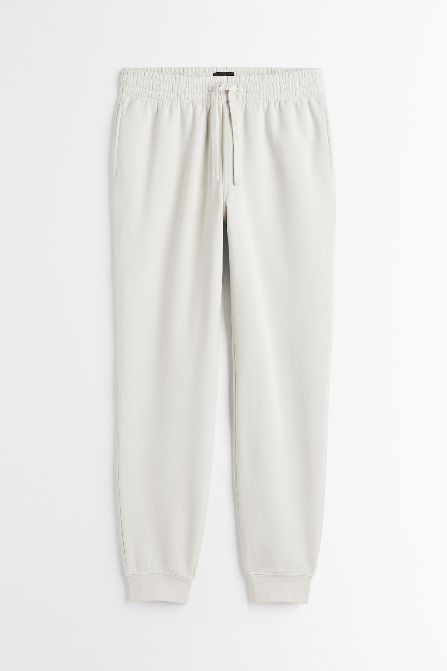 מכנסי טרנינג מבד פוטר דק עשוי תערובת כותנה עם צד פנימי סרוק ורך. גומי ושרוך קשירה במותן, כיסים בצדדים ופס ריב בקרסול. גזרה קלאסית ללבוש נוח ולצללית קלאסית.