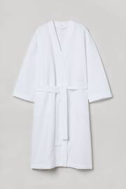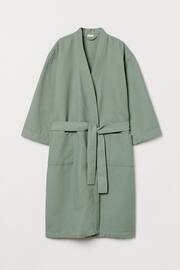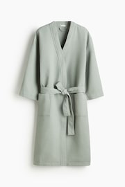 חלוק מאריג ופל רך עשוי תערובת כותנה עם שני כיסים קדמיים וחגורת קשירה במותן.