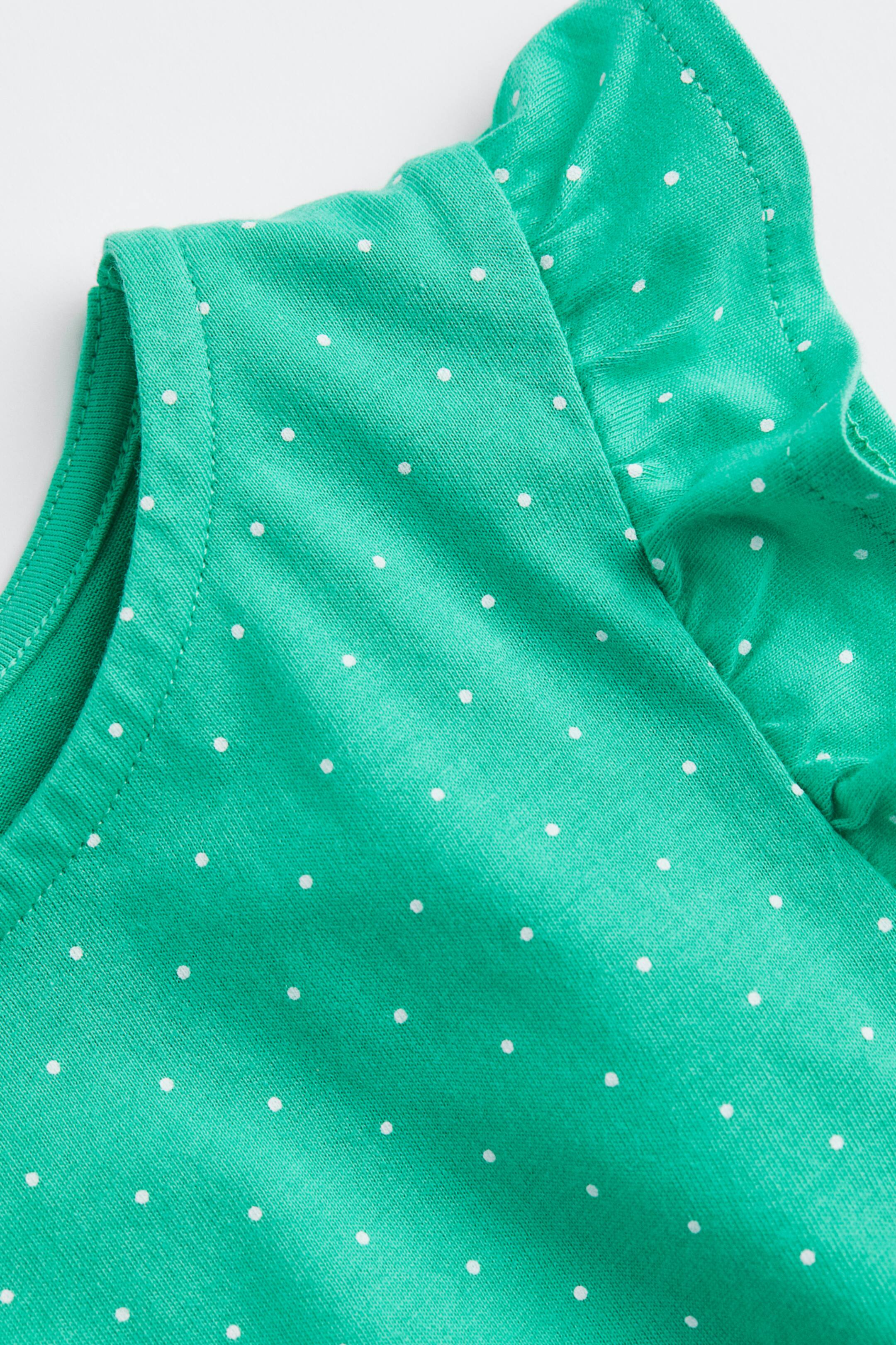 שמלה מג'רזי כותנה רך עם דוגמה. שרוולי פרפר, תפר עם כיווצים במותן וחצאית מתרחבת.