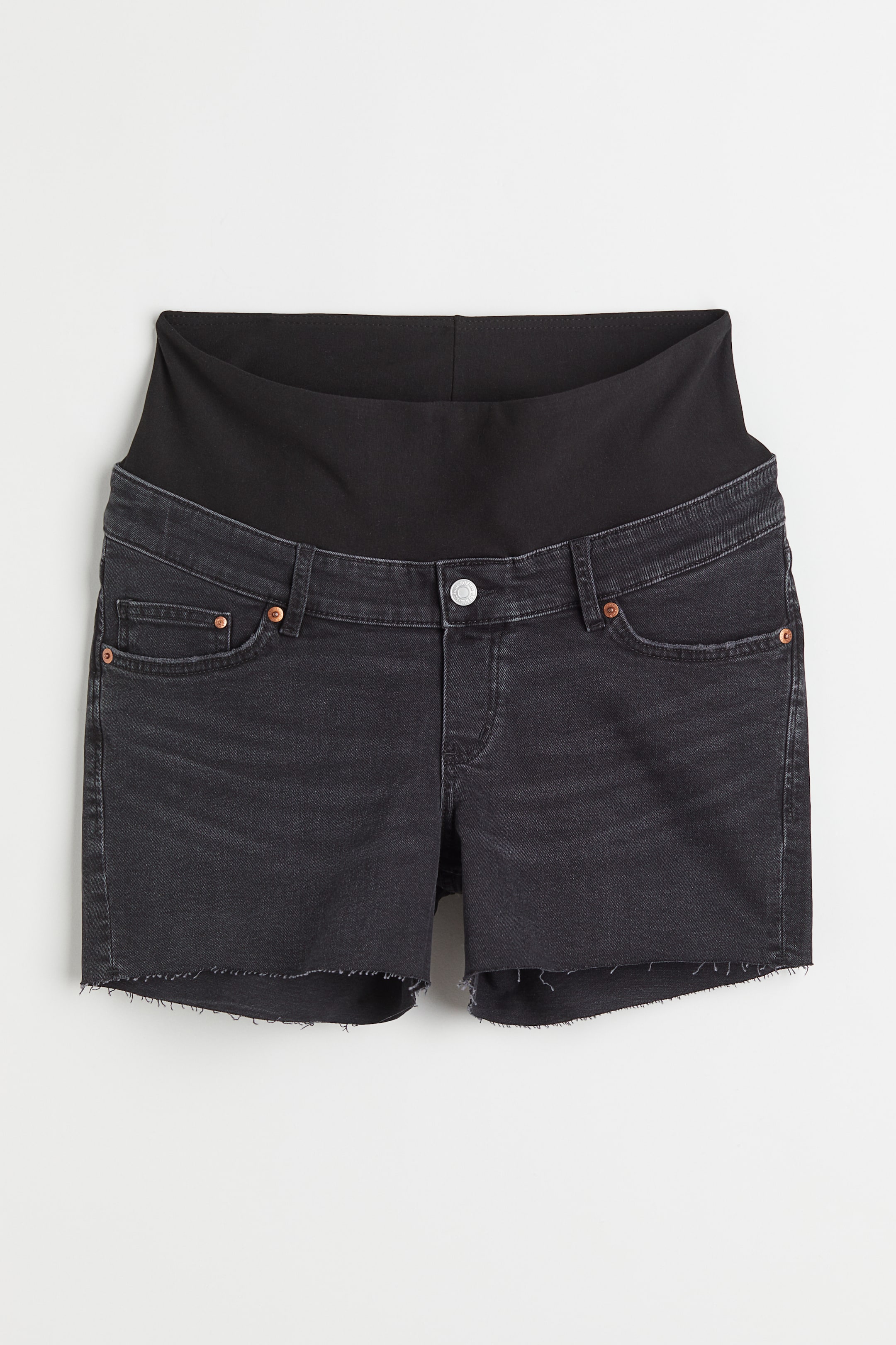 מכנסיים קצרים עם 5 כיסים מג'ינס כותנה סטרץ' עם רצועת ג'רזי רחבה במותן להתאמה מיטבית לבטן, רוכסן מדומה ושוליים גזורים.