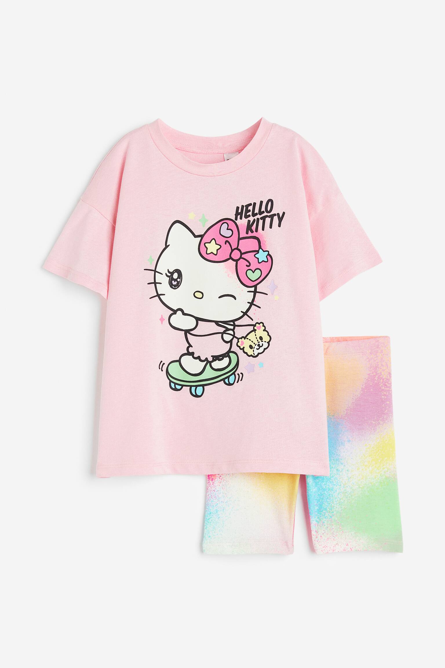 סט הכולל טישירט וזוג מכנסי טייץ קצרים מג'רזי כותנה רך. טישירט עם הדפס וכתפיים נמוכות. מכנסיים קצרים עם גומי במותן.