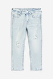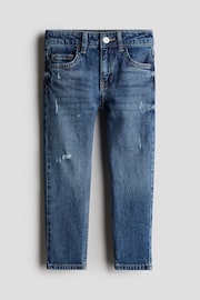 מכנסיים מג'ינס משופשף עם 5 כיסים. גזרה נינוחה במותן ובירכיים והצרה בקרסול. גומי מתכוונן במותן ורכיסה ברוכסן וכפתור.