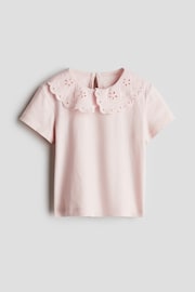 חולצה מג'רזי כותנה רך עם שרוולים קצרים וצווארון מעוגל מפופלין עם תחרה שוויצרית. פתח קטן בעורף הנרכס בכפתור.