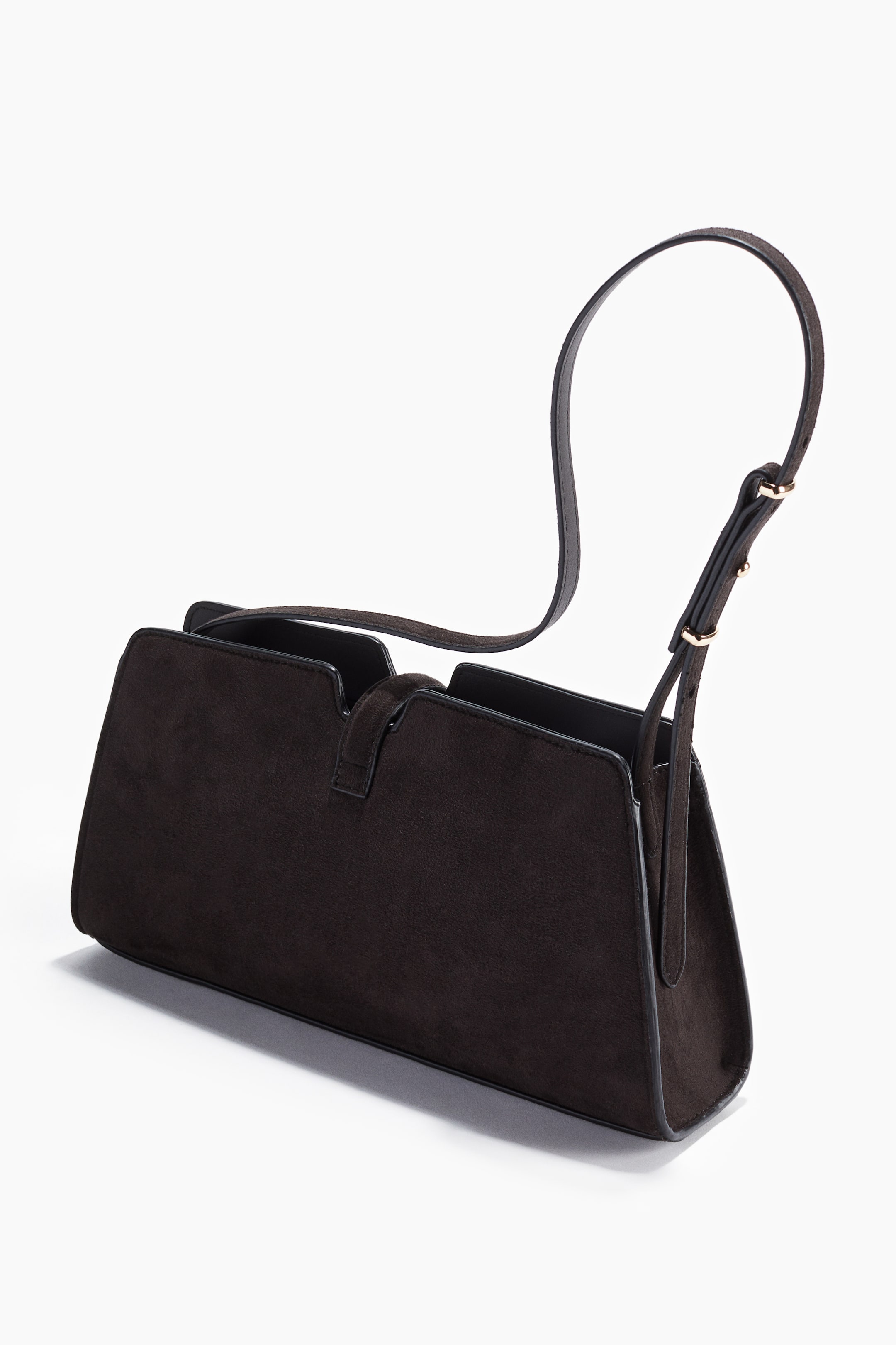 תיק צד עם רצועת כתף צרה ומתכווננת, לשונית בחלק העליון עם אבזם מתכת בחזית ותא פנימי עם רוכסן. עם בטנה.