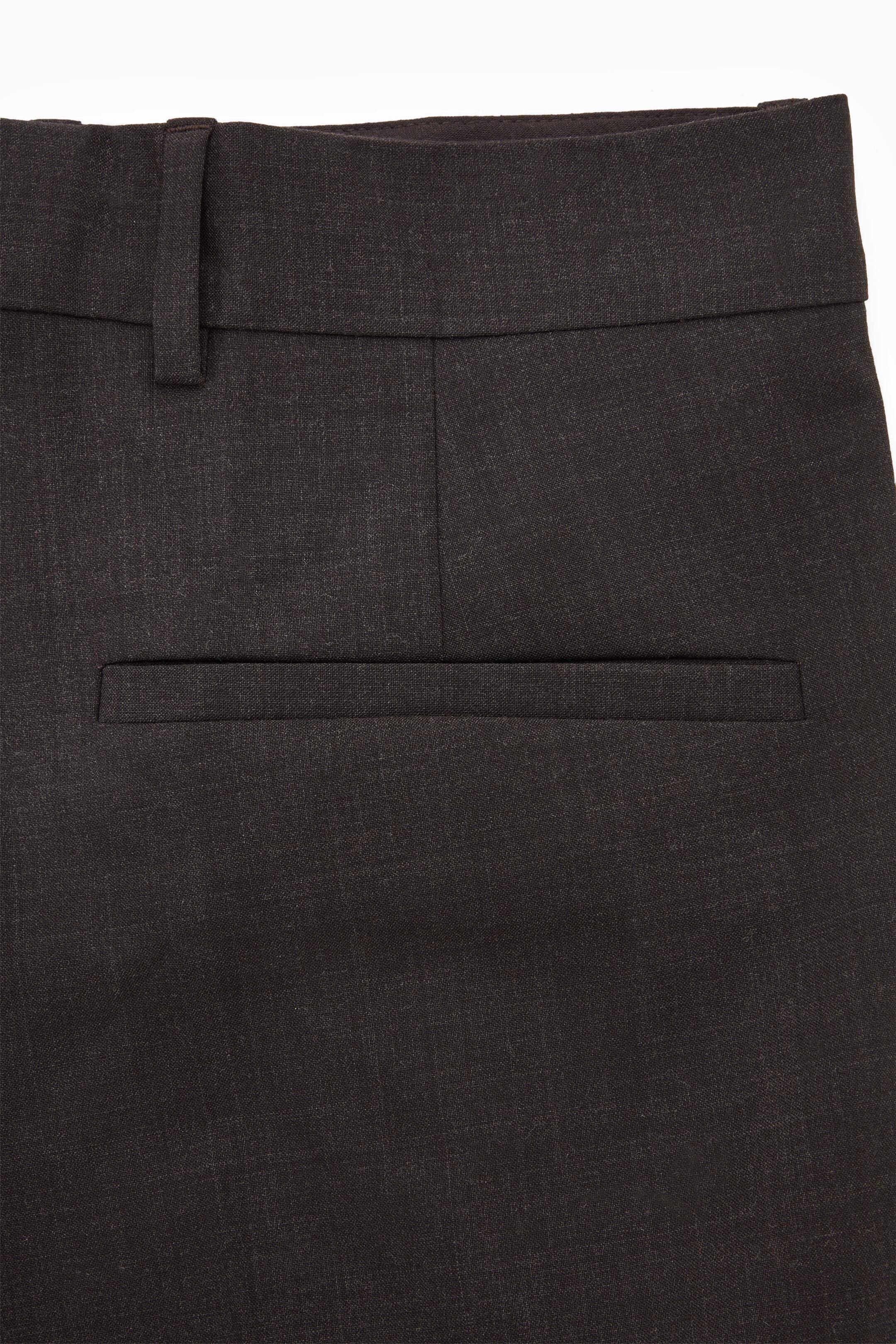 At COS we're committed to quality tailoring, and our design team have been working on perfecting our slim-fit trousers. This tailored dark-brown pair is crafted from a traceable wool blend that's been certified by the Responsible Wool Standard and features full-length legs and sharp front and back creases. Traditional details include the hook-and-bar closure, zip fly and back welt pocket. Side-seam pockets This product contains Responsible Wool Standard TE-00047206 (RWS) wool fibre from farms certified to animal welfare and land-management requirements Shell: 53% RWS Wool, 30% Recycled polyester, 13% Polyester, 4% Elastane. Excluding trims / Machine wash Side seam length of size EU 48 is 101cm / Model wears a size EU 48