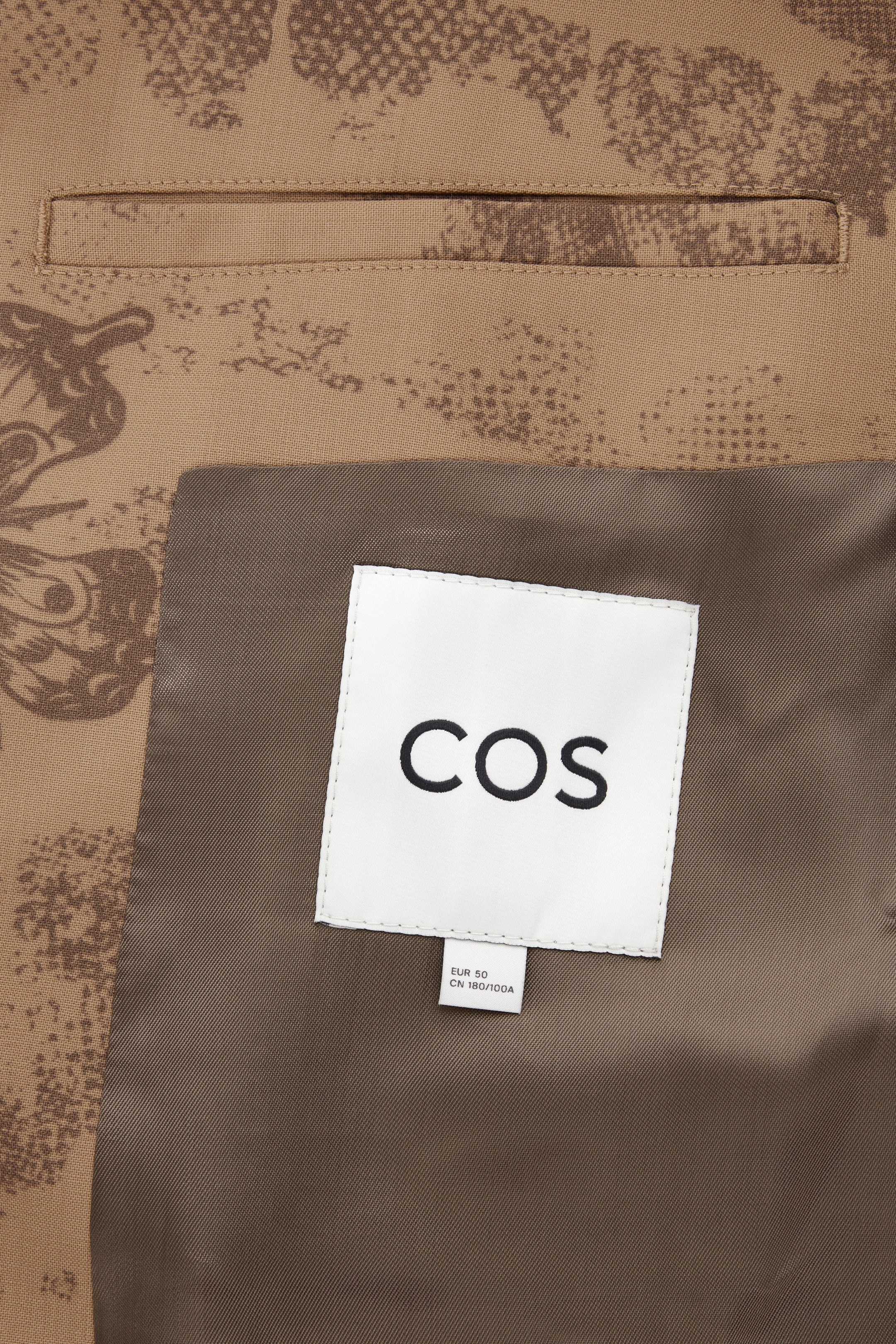 COS × YEBOAH combines street-luxe wear with contemporary tailoring. Focusing on individualism and authenticity, the exclusive collaboration celebrates a personal story and the power of community. This blazer speaks to YEBOAH's commitment to quality suiting. Crafted from premium wool, it's tailored in a broadening double-breasted shape with slightly dropped shoulders that enhance the relaxed fit. It's decorated with intricate sketches of butterflies in flight. For a complete set, wear with its matching item - Peak lapels, double vent - Internal pocket, fully lined - Certified according to the Responsible Wool Standard, to protect the welfare of the sheep and their environment 96% RWS Wool, 4% Elastane, Lining: 100% Recycled polyester / Dry clean Back length of size EU 48 is 77.75cm / Model wears a size EU 48