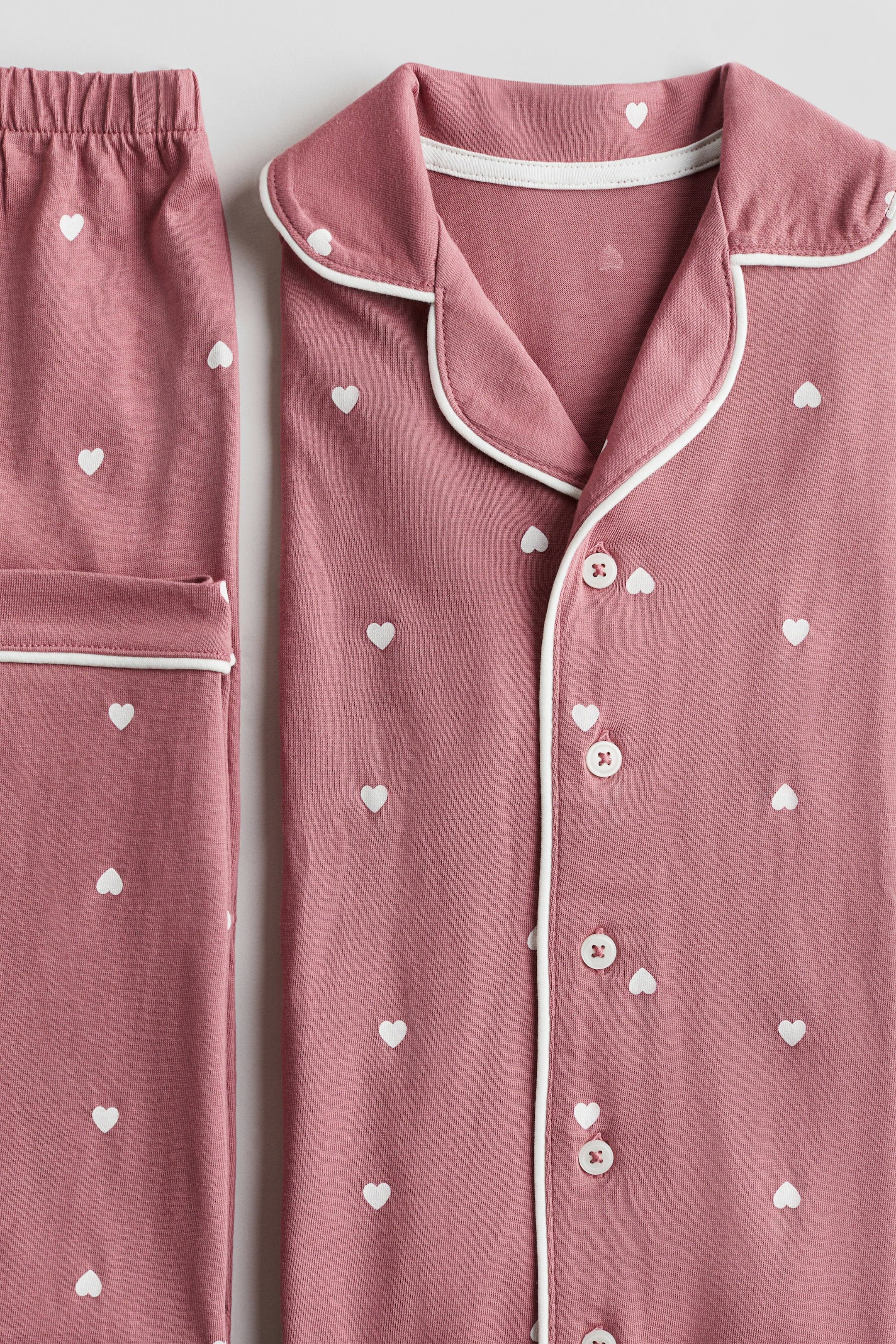 Pigiama composto da camicia e pantaloni in morbido jersey di cotone fantasia con profili in colore contrastante.Camicia con revers classici e bottoni davanti, spalle ribassate. Maniche lunghe, linea leggermente arrotondata in basso.Pantaloni con elastico rivestito in vita.