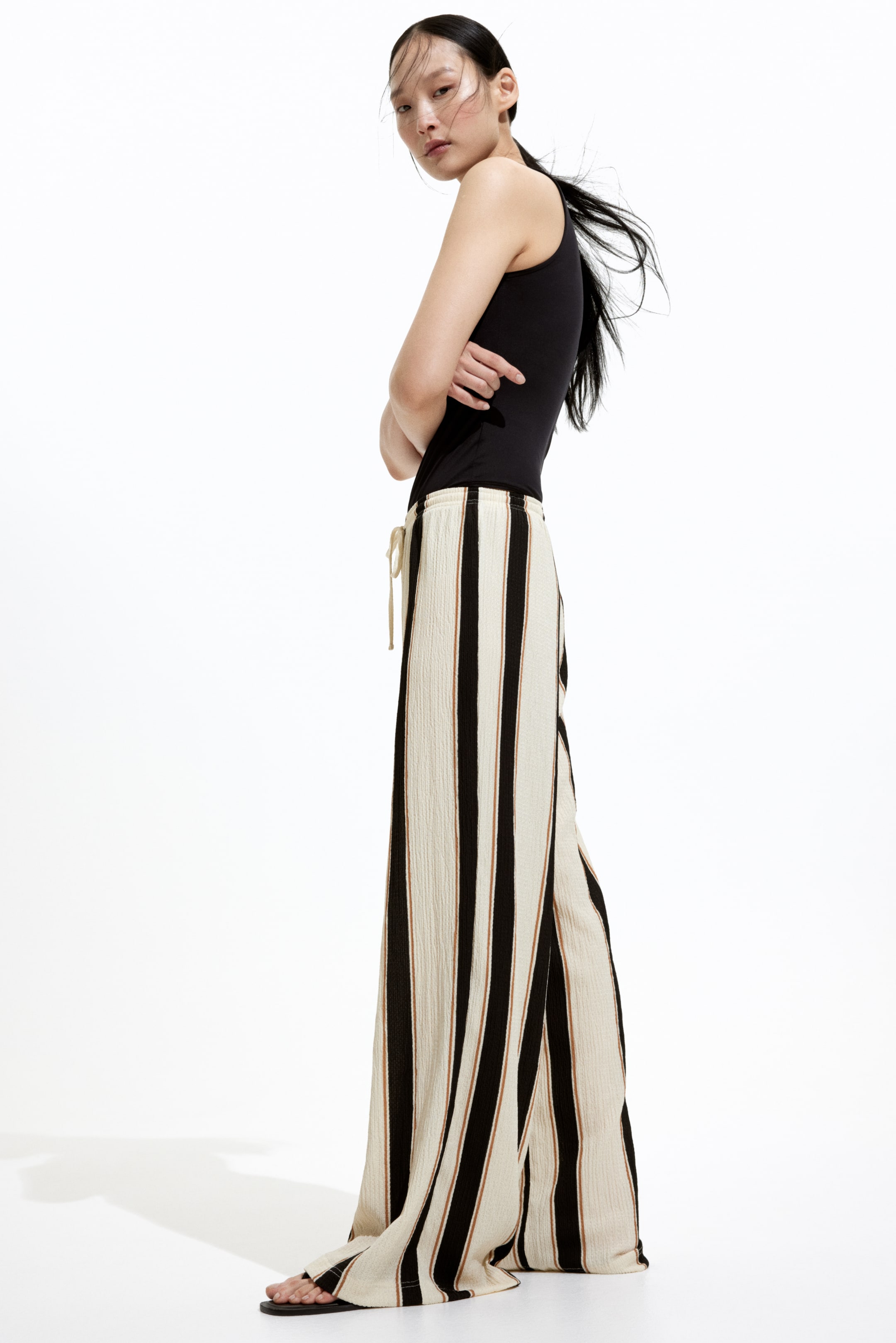 Pantaloni dalla linea ampia in jersey. Vita alta ed elasticizzata con coulisse, gamba ampia.