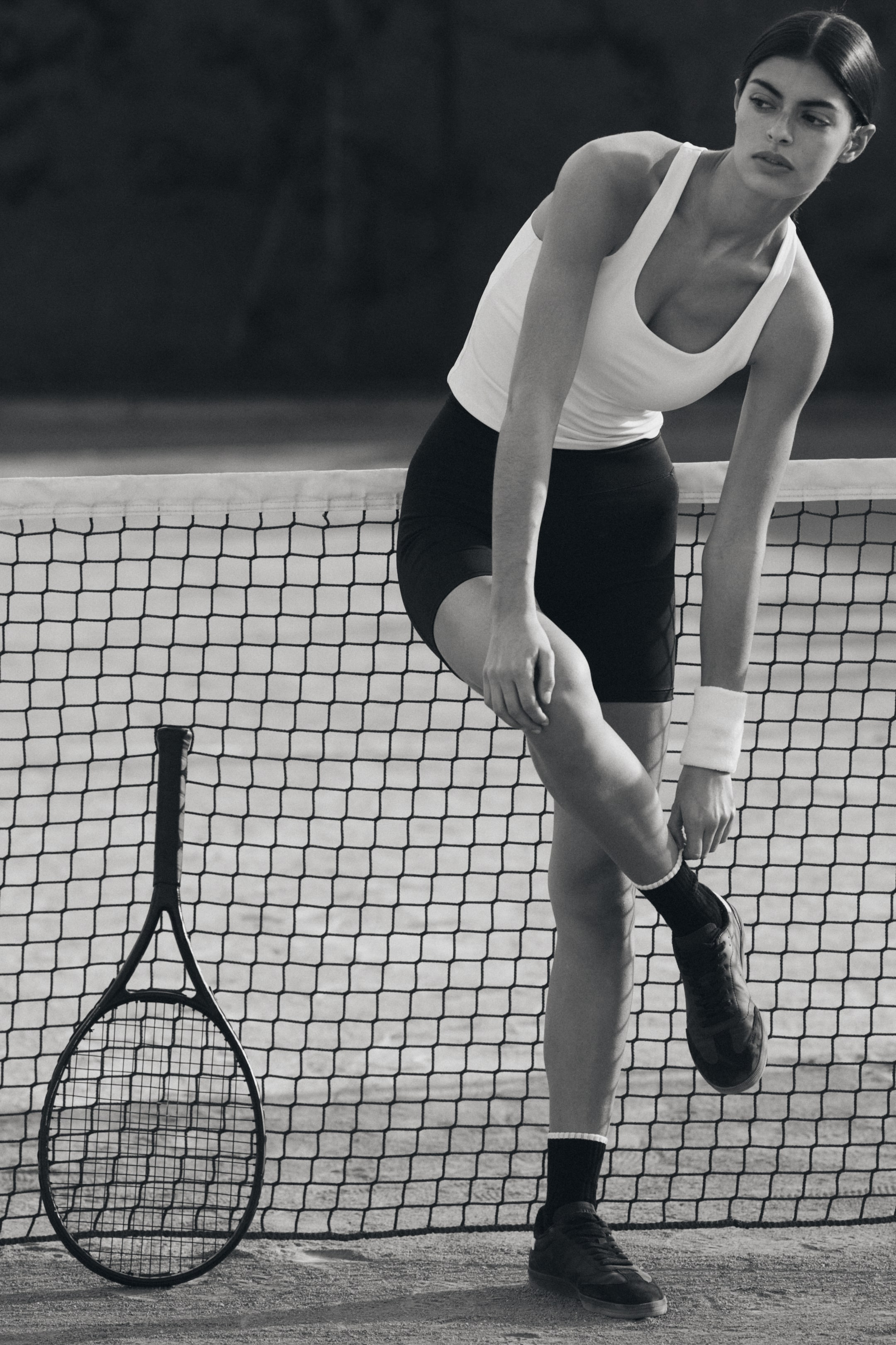 Top sportivo corto in tessuto tecnico con DryMove™, che aiuta ad allontanare l'umidità dalla pelle regalando il massimo comfort durante l'attività sportiva. Linea aderente con reggiseno sportivo integrato con coppe imbottite che modellano il seno. Elastico nascosto in basso. Spalline larghe davanti, olimpioniche dietro.