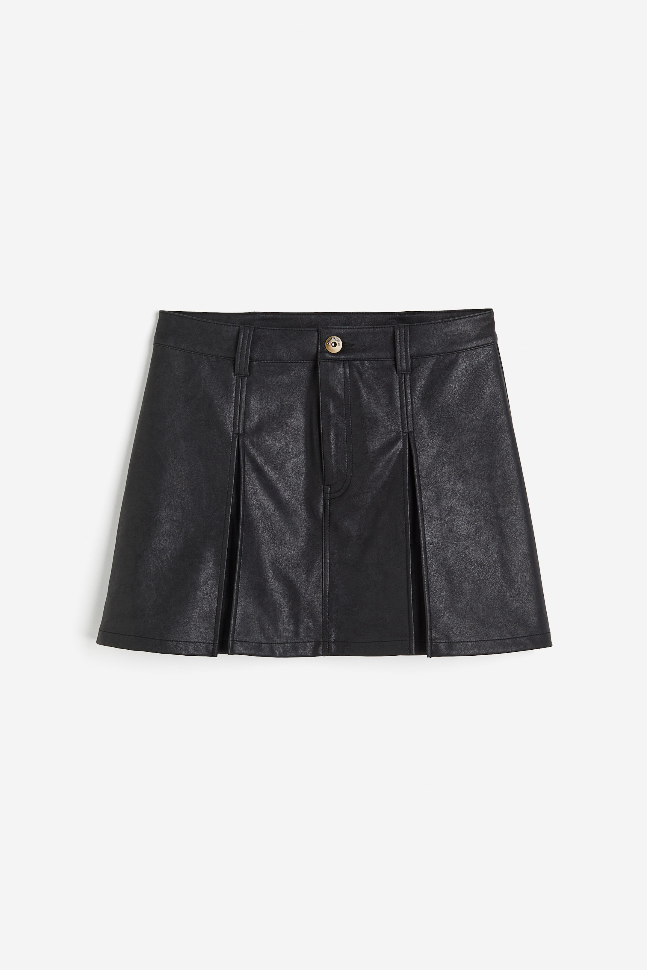 Minigonna a pieghe in tessuto con coating, linea ampia. Vita normale, patta con cerniera e bottone. Sfoderata.