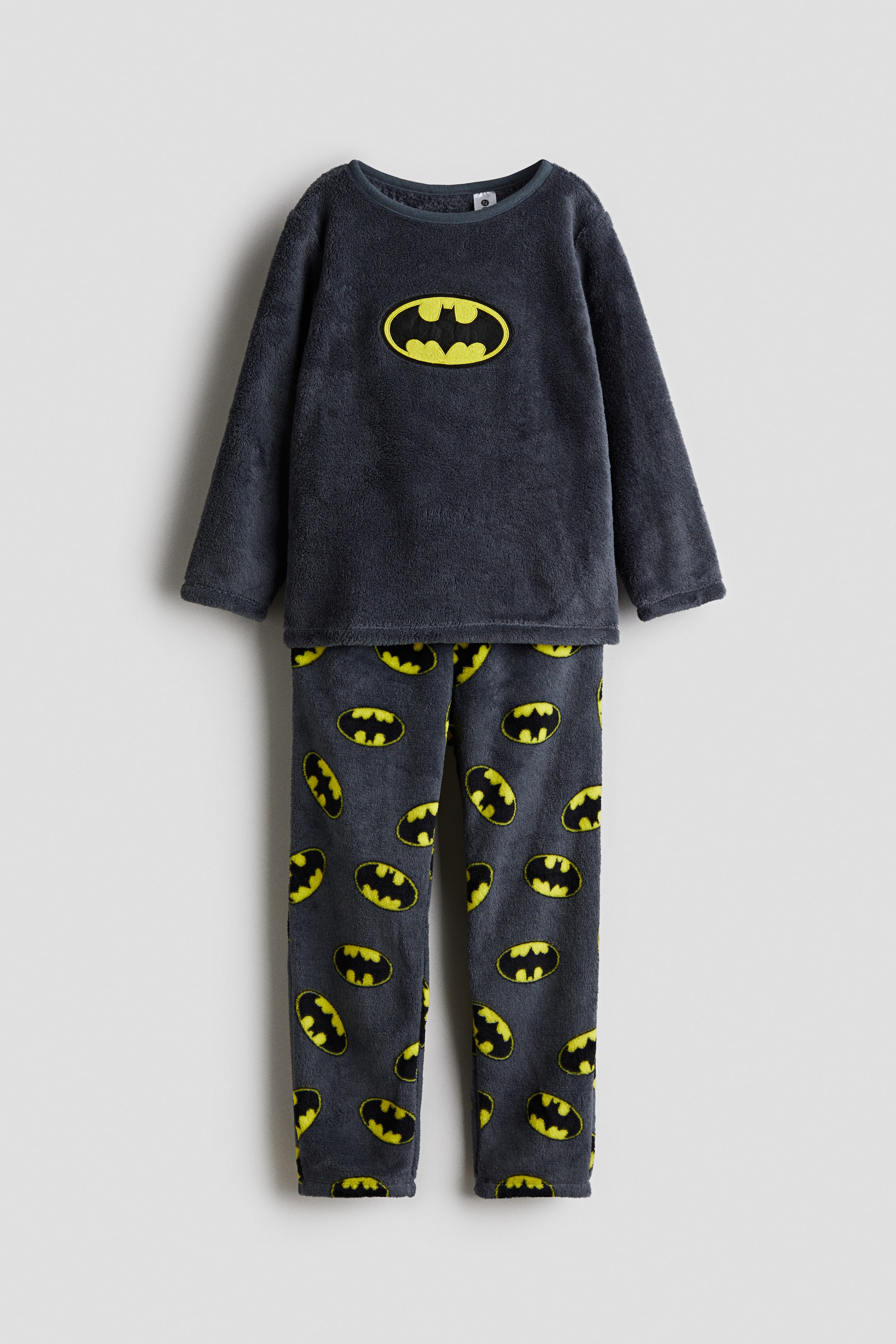 Pigiama in morbido velour stampato. Maglia a maniche lunghe. Scollo rotondo con bordo sottile in jersey a coste. Pantaloni con elastico in vita e bordi in jersey a coste a fondo gamba.