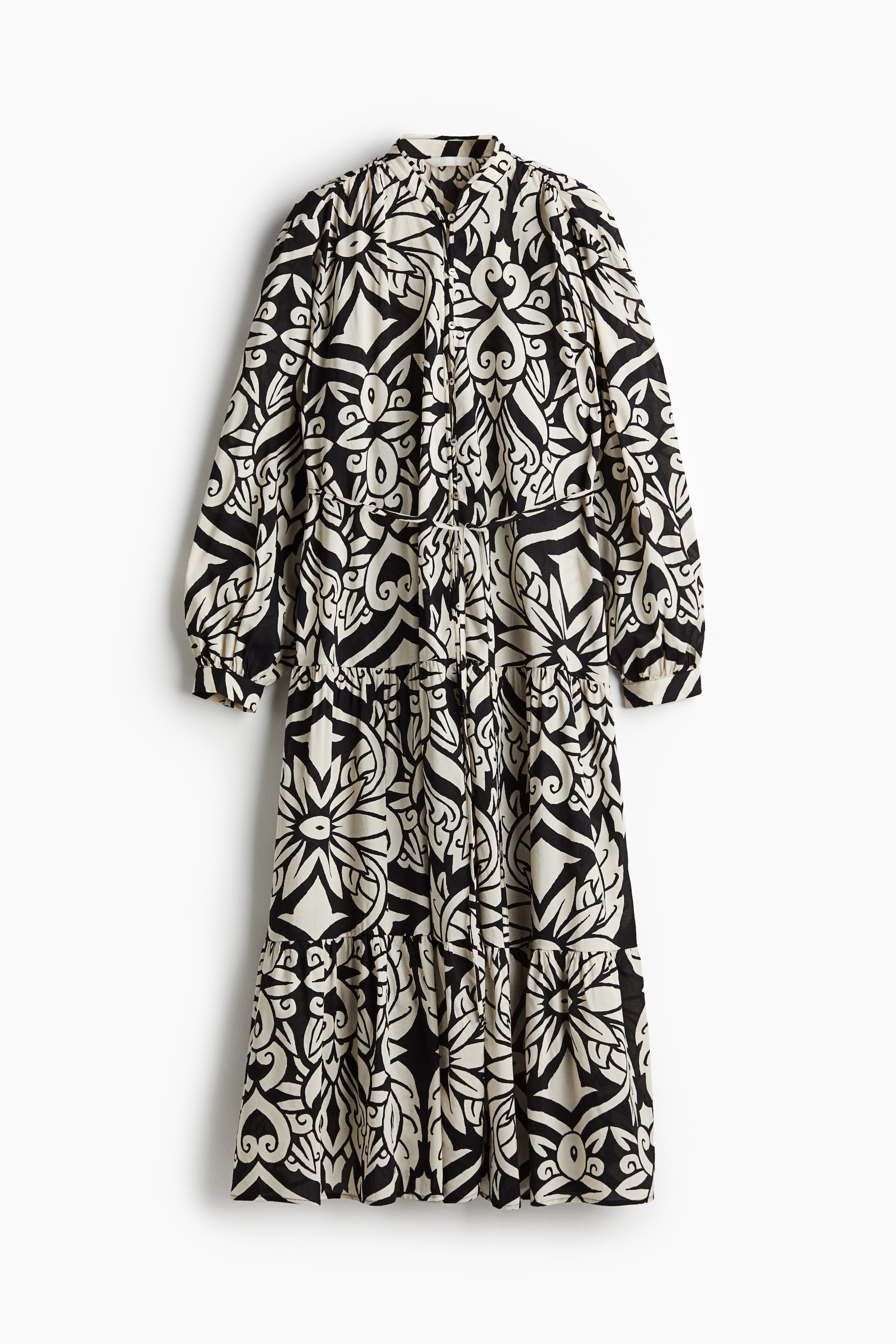 Abito oversize e lungo alla caviglia in tessuto leggero di misto cotone e viscosa. Colletto alla coreana, arricciature sulle spalle e sulla nuca per un effetto leggermente drappeggiato. Bottoni iridescenti sul davanti, cintura sottile e staccabile da annodare in vita. Maniche lunghe a palloncino, polsino basso con spacchetto e bottone. Gonna svasata con balze arricciate. Sfoderato.