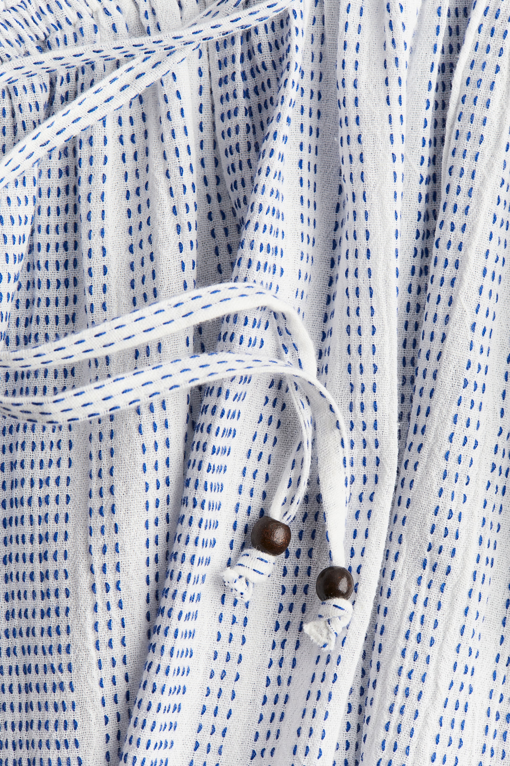 Abito in tessuto operato di cotone, lunghezza alla caviglia. Scollo a V, maniche corte, elastico rivestito sotto il seno e laccetti decorativi da annodare su un lato. Sfoderato.