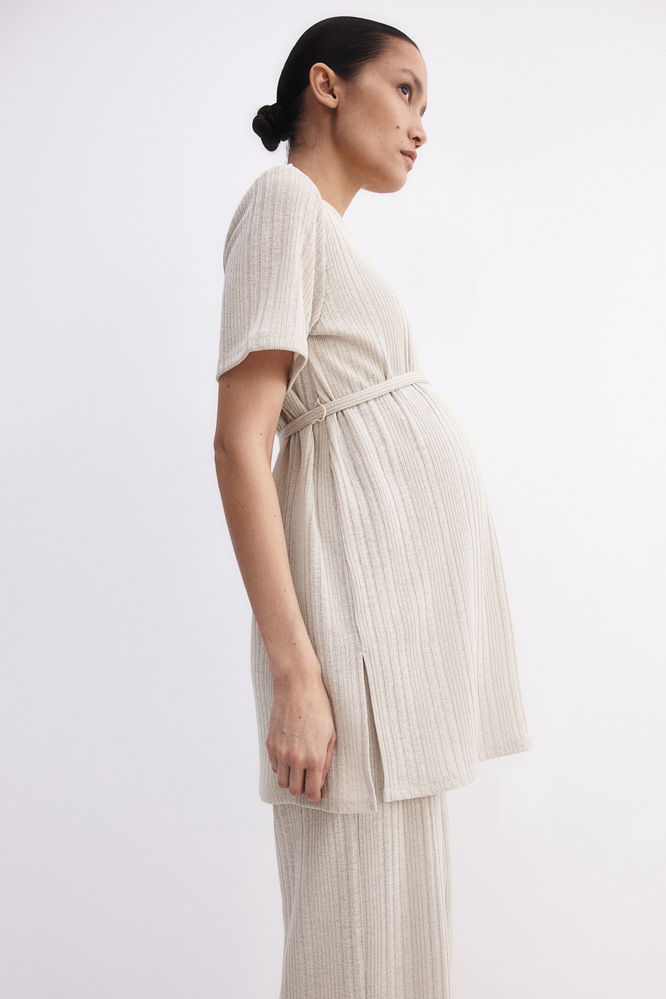 Set composto da top lungo e pantaloni in morbida maglia a coste. Top con scollo rotondo e maniche corte, cintura staccabile da annodare sotto il seno. Spacchetti ai lati in basso. Pantaloni dritti con ampio pannello in vita per una vestibilità comoda sul pancione.