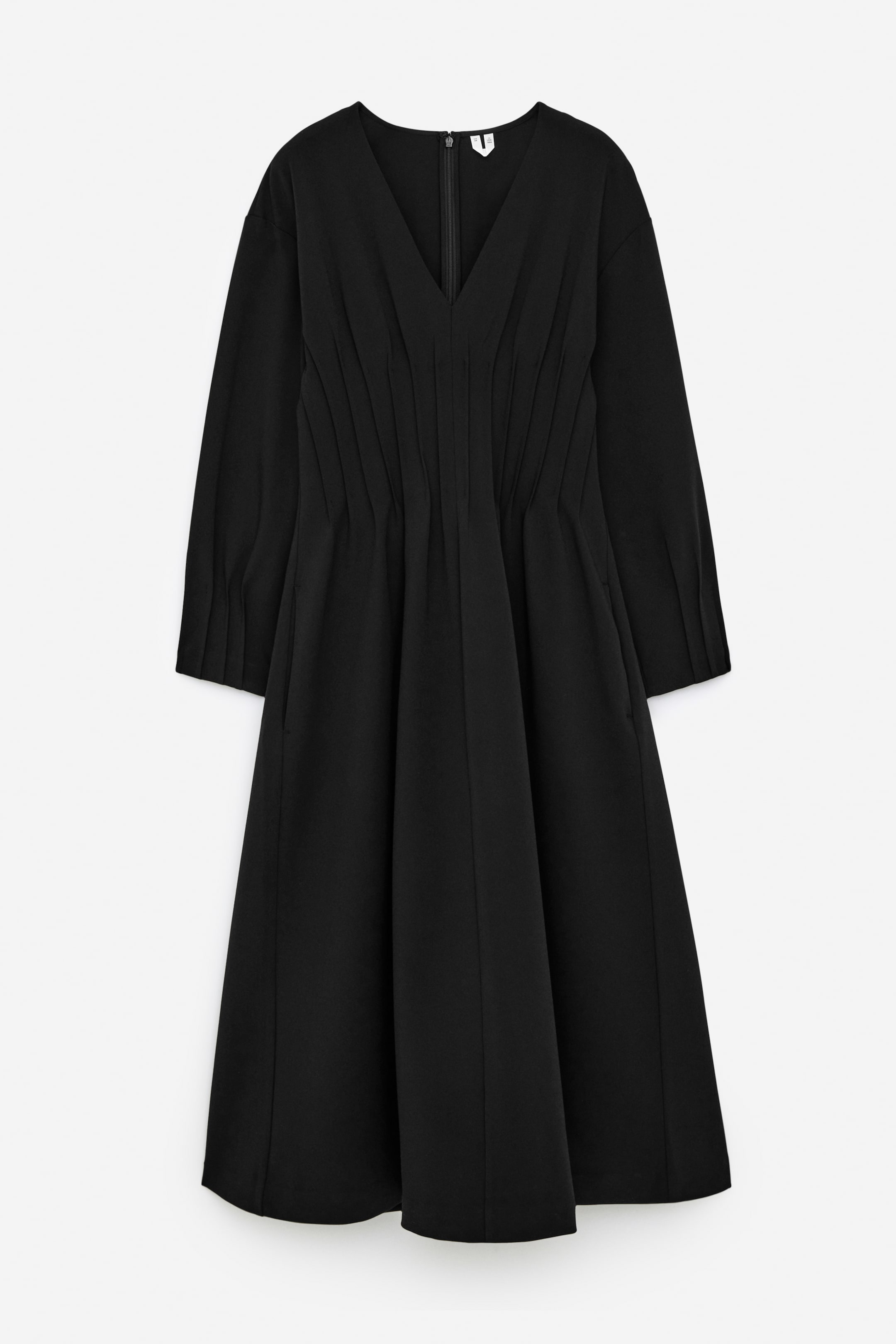 V-neck dress with stitched pleats at waist and at sleeve ends to accentuate the silhouette. An unlined style with a hidden zip at centre back.