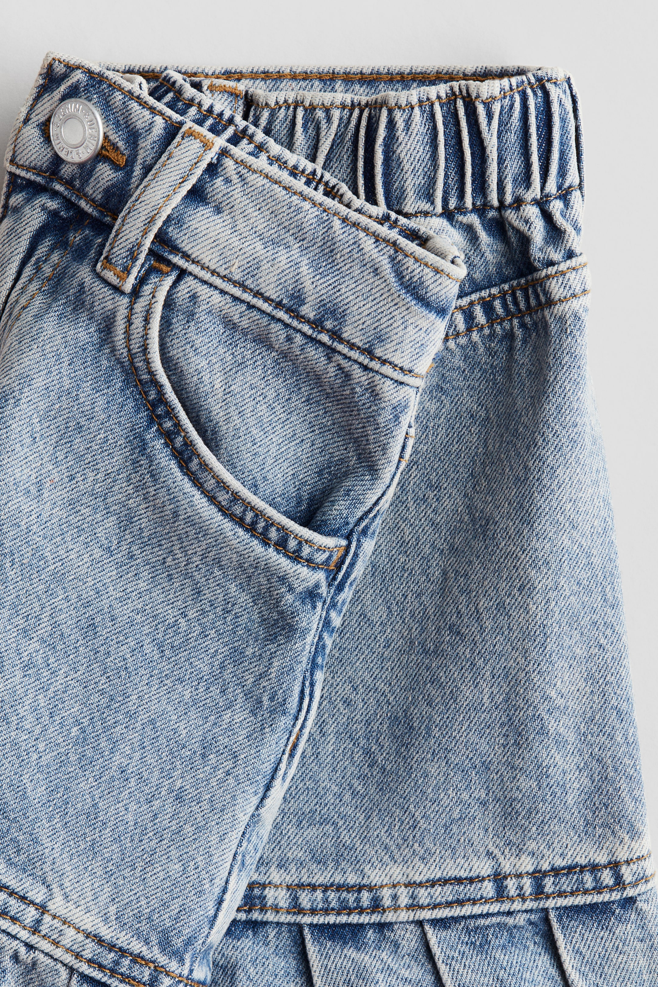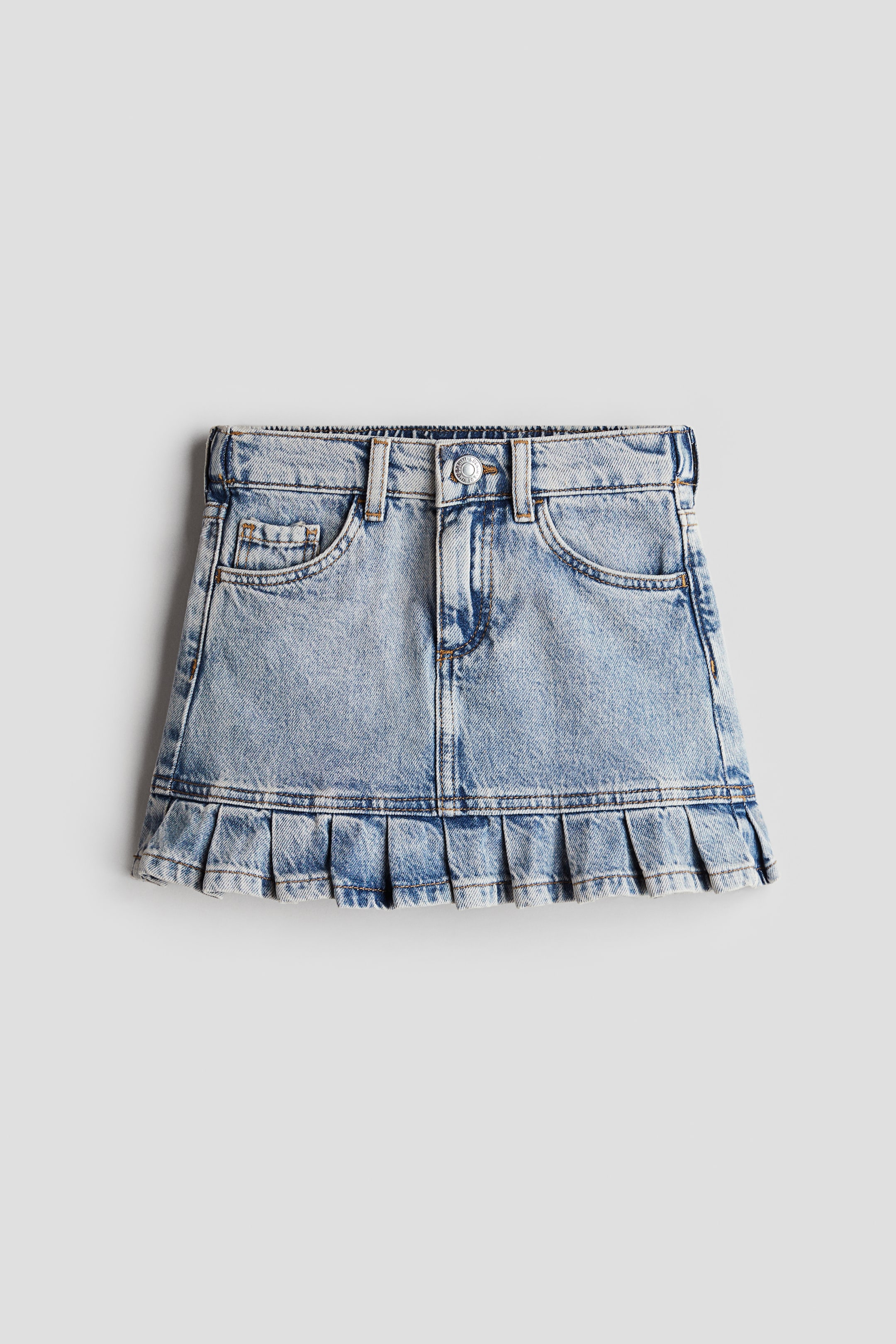 Gonna svasata in denim di cotone lavato. Elastico regolabile in vita, patta con cerniera e bottone. Tasche davanti, un taschino portamonete, bordo a pieghe in basso.