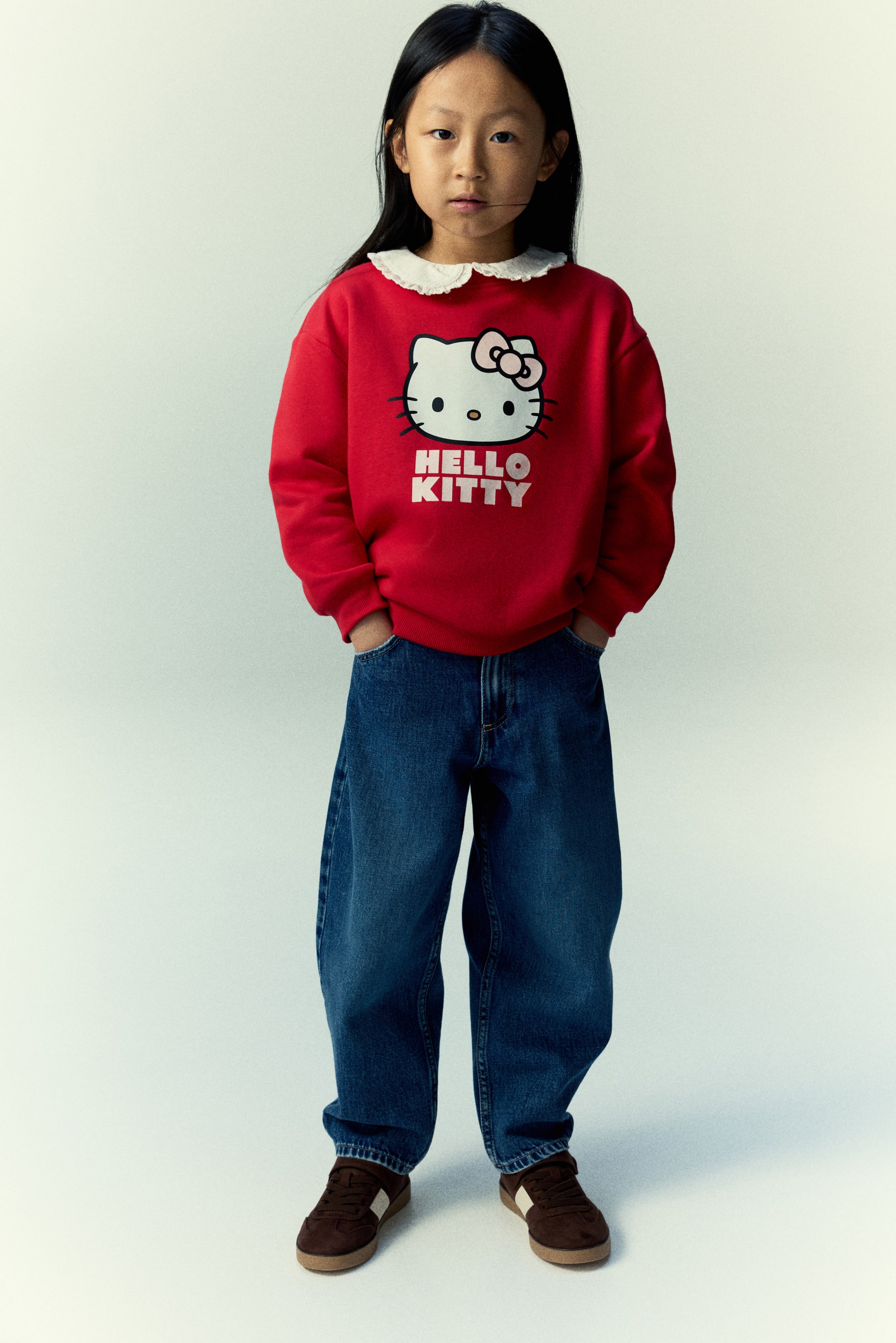 Maglia in tessuto felpato con stampa e morbido interno spazzolato. Scollo rotondo con bordo a costine, maniche lunghe e voluminose. Bordo in maglina a fondo manica e in basso.