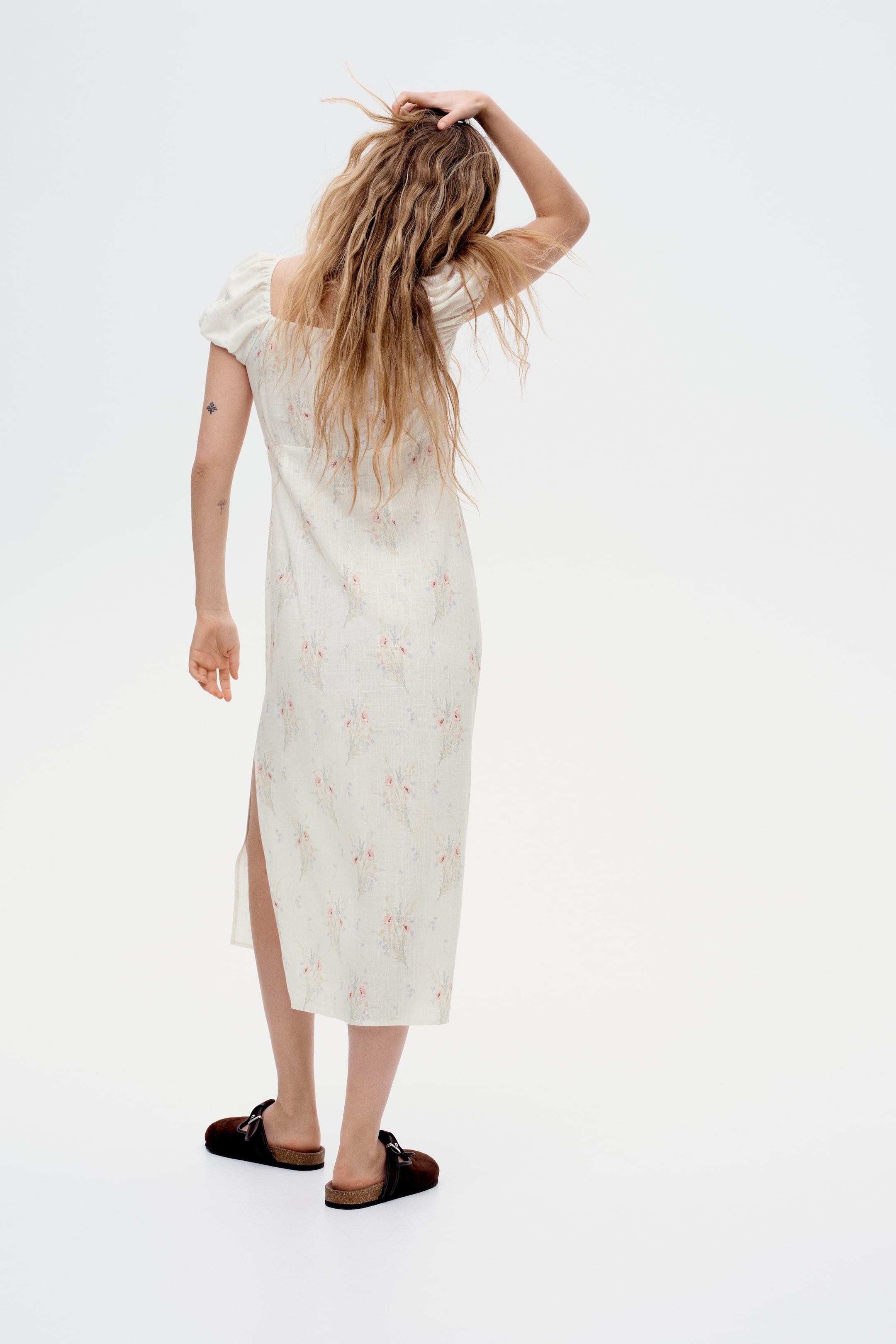 Abito lungo in tessuto leggero di misto viscosa e lino. Scollo a cuore con nastrino sottile da annodare davanti, maniche corte a sbuffo e coppe preformate e arricciate. Elastico sottile lungo lo scollo, sulle spalle e a fondo manica. Cerniera nascosta su un lato, linea dritta in basso con profondo spacco laterale. Sfoderato.