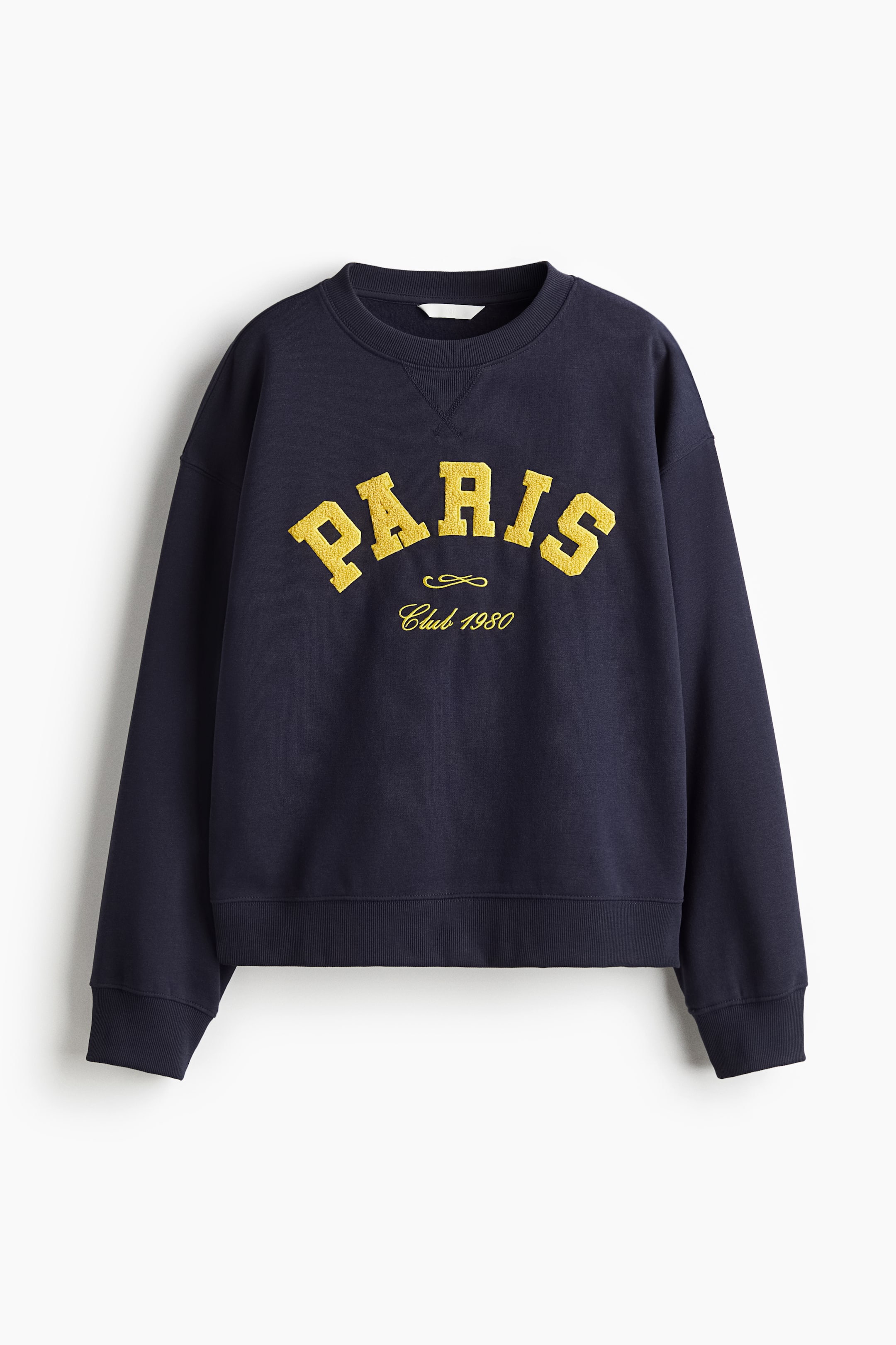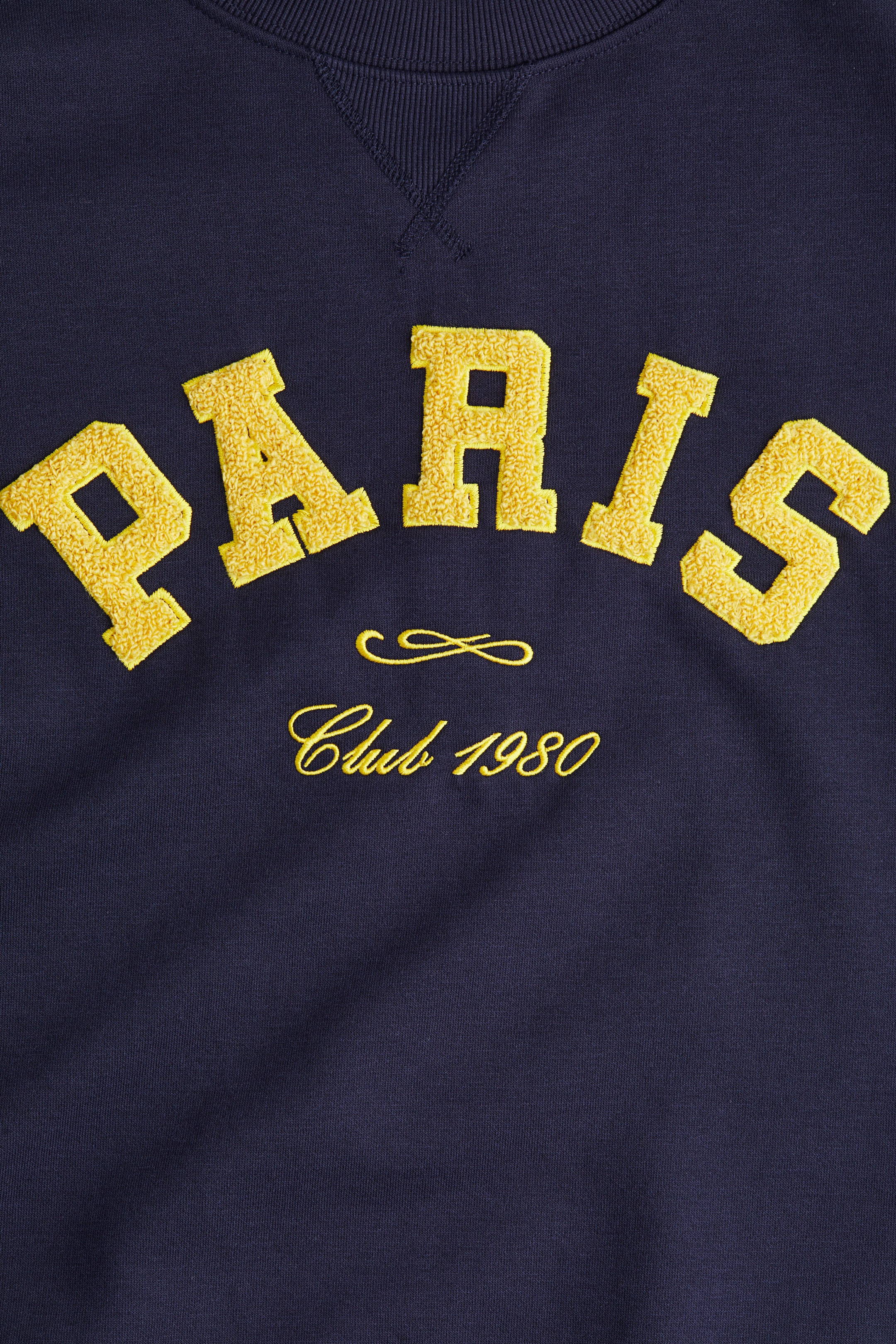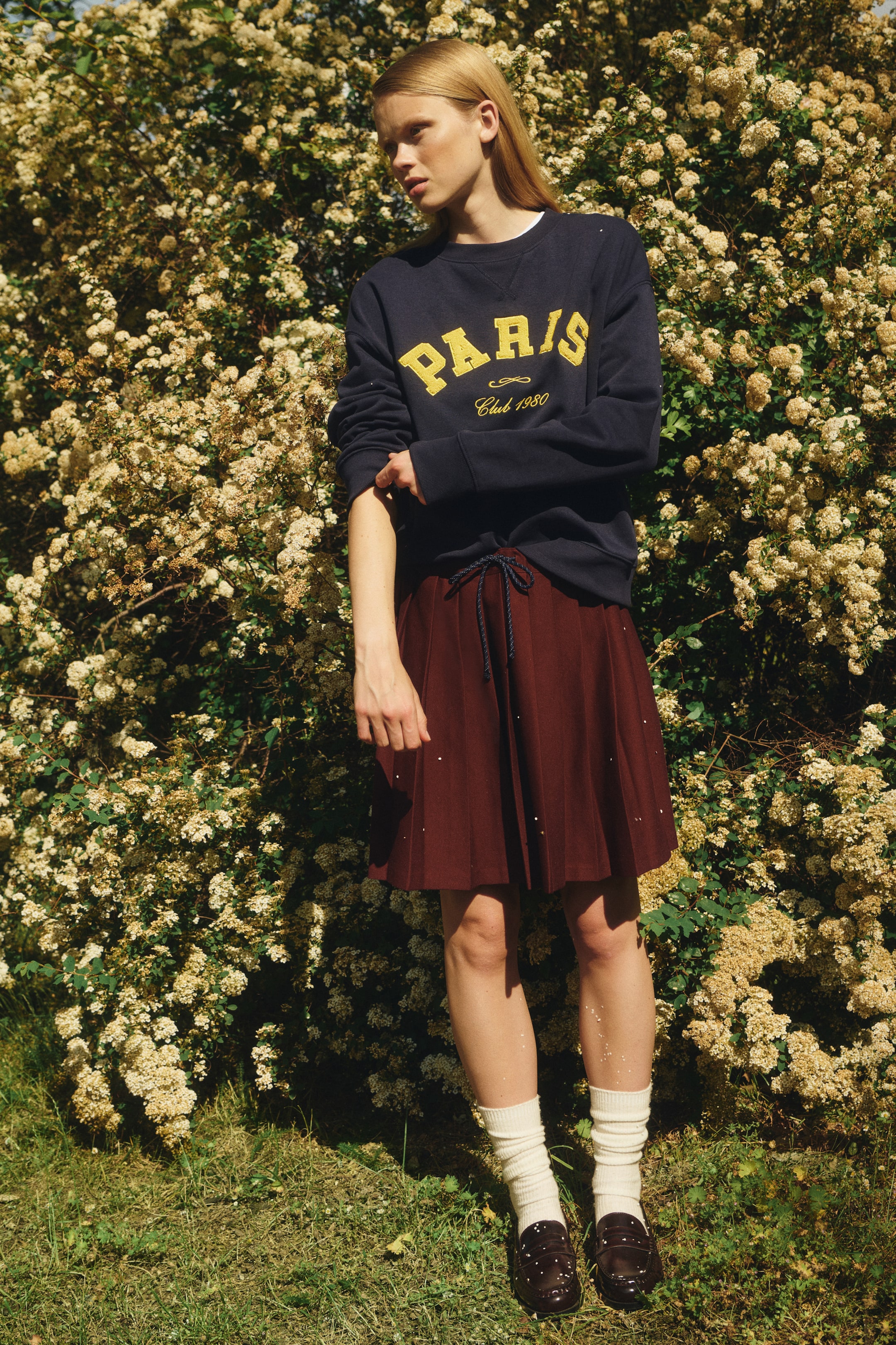 Maglia oversize in tessuto felpato con morbido interno spazzolato. Testo stampato sul petto. Spalle basse e maniche lunghe. Bordi a costine sullo scollo, a fondo manica e in basso.