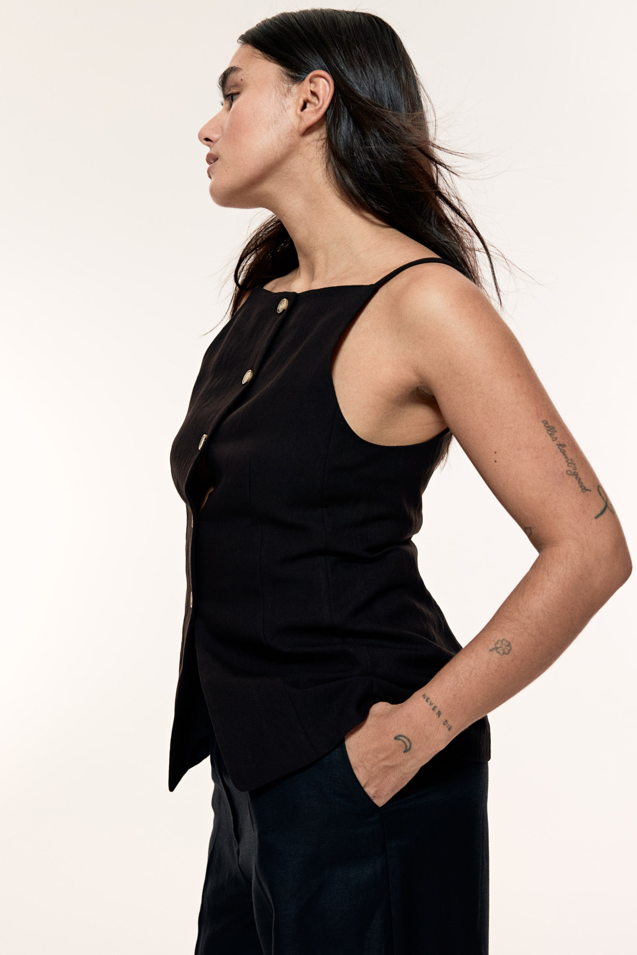 Panciotto elegante in tessuto con scollo dritto e spalline sottili. Bottoniera fino in vita, che crea un taglio svasato verso il basso. Cuciture modellanti davanti e dietro.