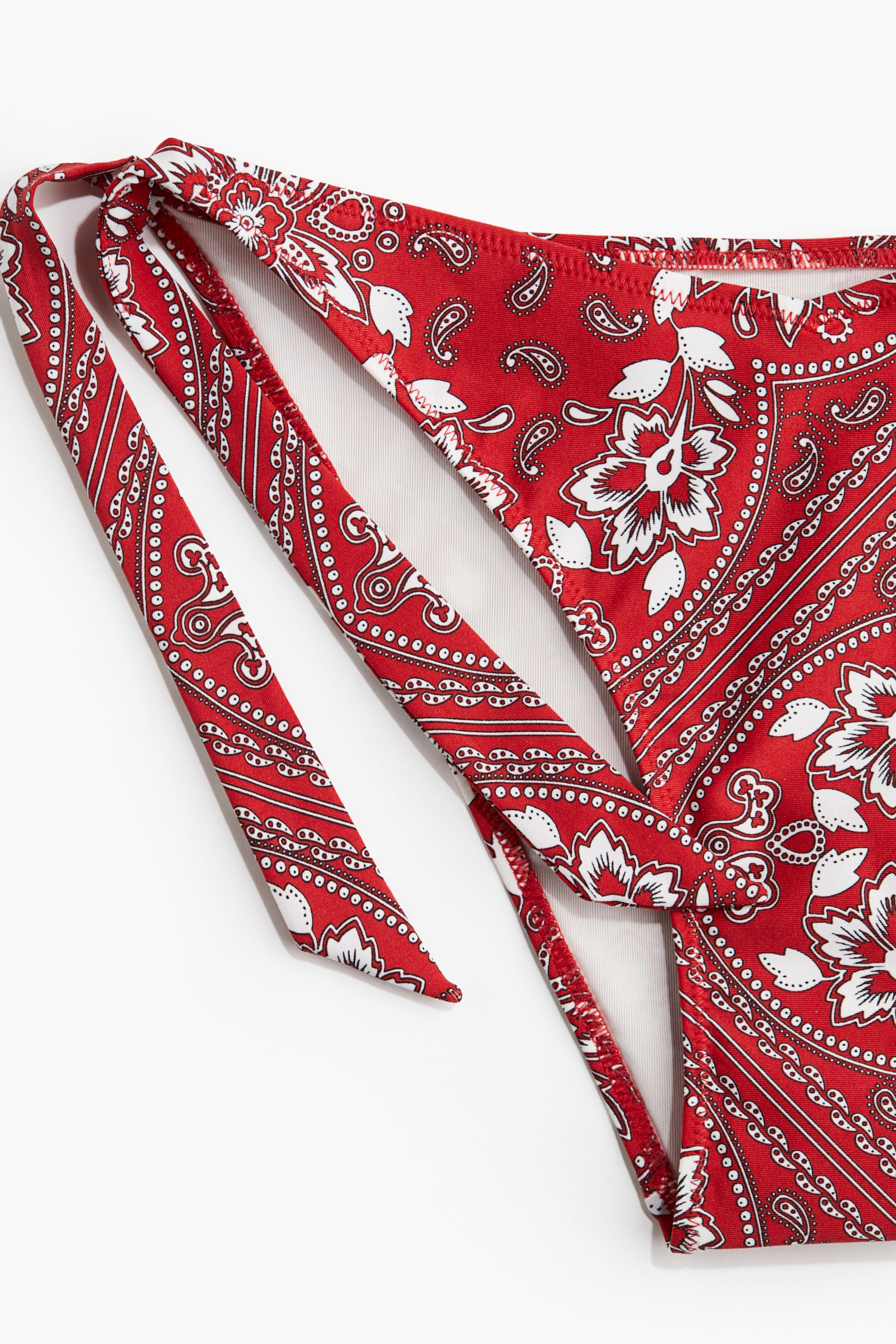 Slip per bikini interamente foderati con laccetti da annodare sui fianchi. Modello poco coprente dietro, vita normale dal taglio a V.